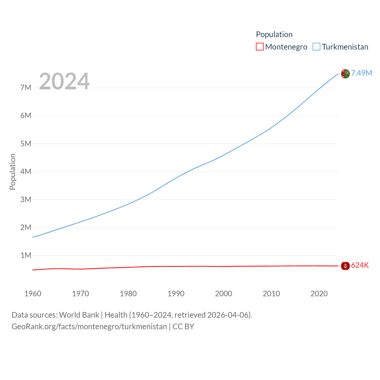 Montenegro has a population of 624K (ranked 166/197), compared with 7.49M in Turkmenistan (ranked 104/197). Montenegro's land area is 5,193 sq mi versus 181,441 sq mi for Turkmenistan (ranked 156th vs. 53rd).
