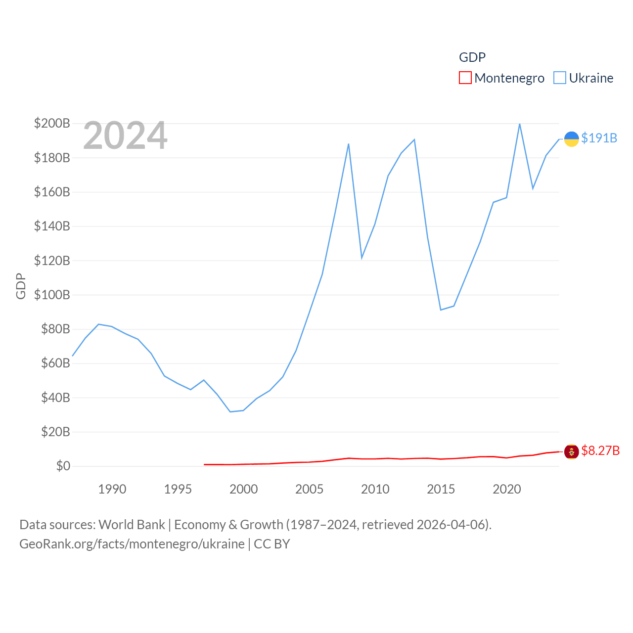By GDP, Montenegro ranks 155/197 ($8.27B) and Ukraine ranks 57/197 ($191B). By GDP per capita, Montenegro ranks 77/197 ($13,263), while Ukraine ranks 120/197 ($5,038).