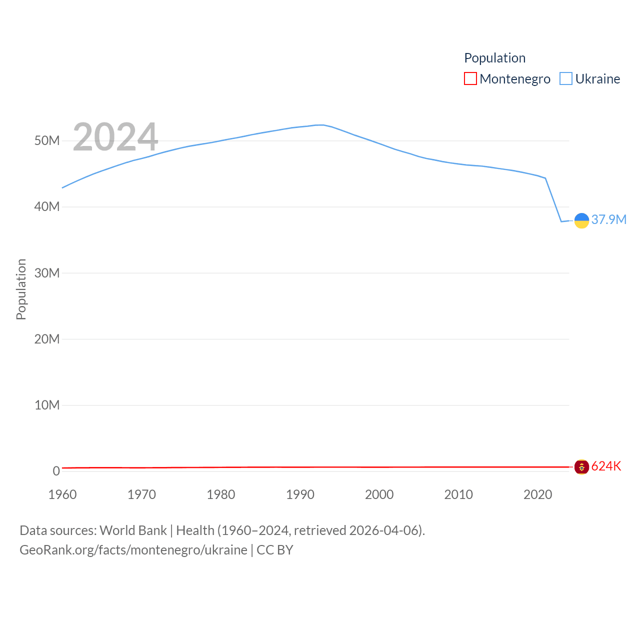 Montenegro has a population of 624K (ranked 166/197), compared with 37.9M in Ukraine (ranked 41/197). Montenegro's land area is 5,193 sq mi versus 223,708 sq mi for Ukraine (ranked 156th vs. 46th).