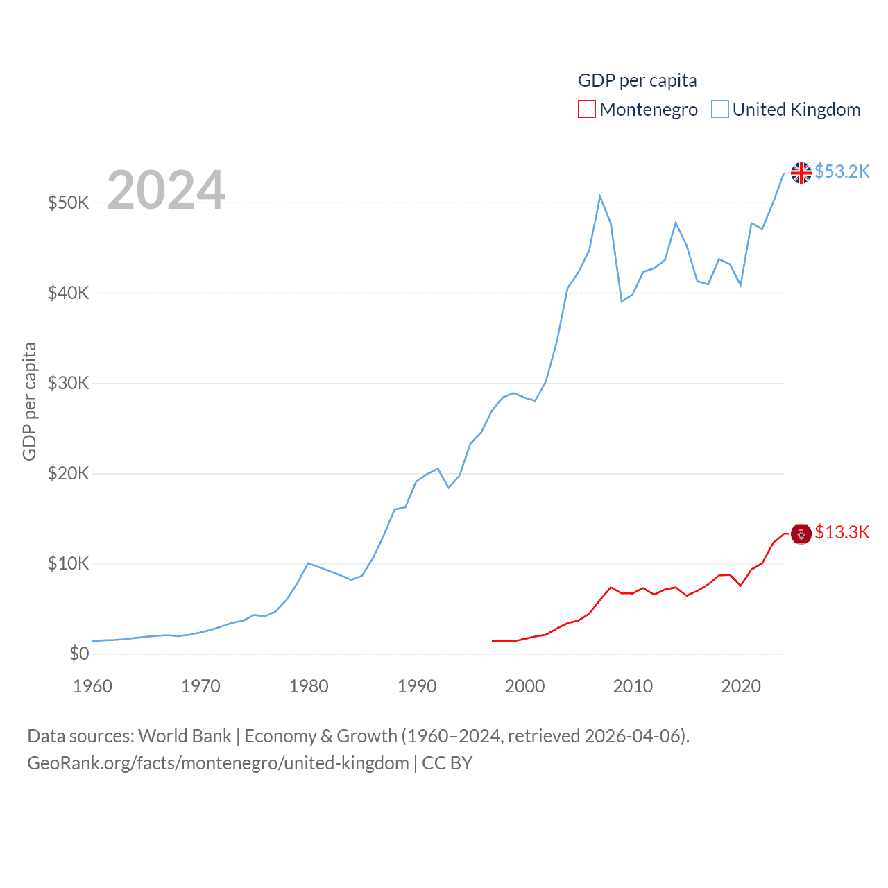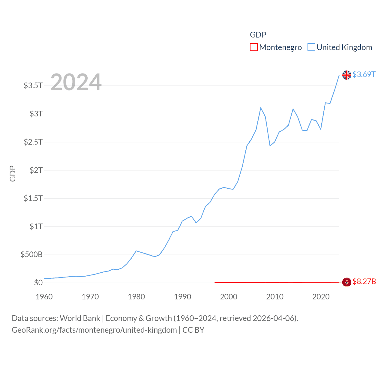 By GDP, Montenegro ranks 155/197 ($8.27B) and The United Kingdom ranks 6/197 ($3.69T). By GDP per capita, Montenegro ranks 77/197 ($13,263), while The United Kingdom ranks 22/197 ($53,246).