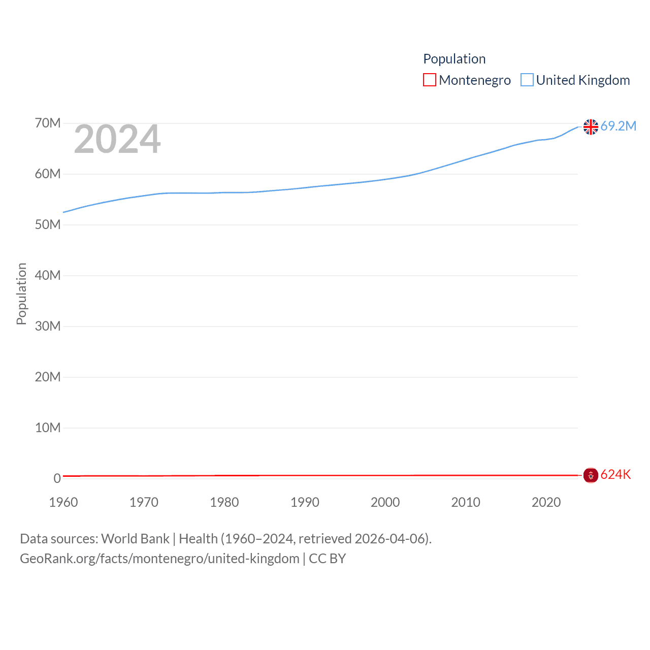 Montenegro has a population of 624K (ranked 166/197), compared with 69.2M in The United Kingdom (ranked 21/197). Montenegro's land area is 5,193 sq mi versus 93,410 sq mi for The United Kingdom (ranked 156th vs. 78th).