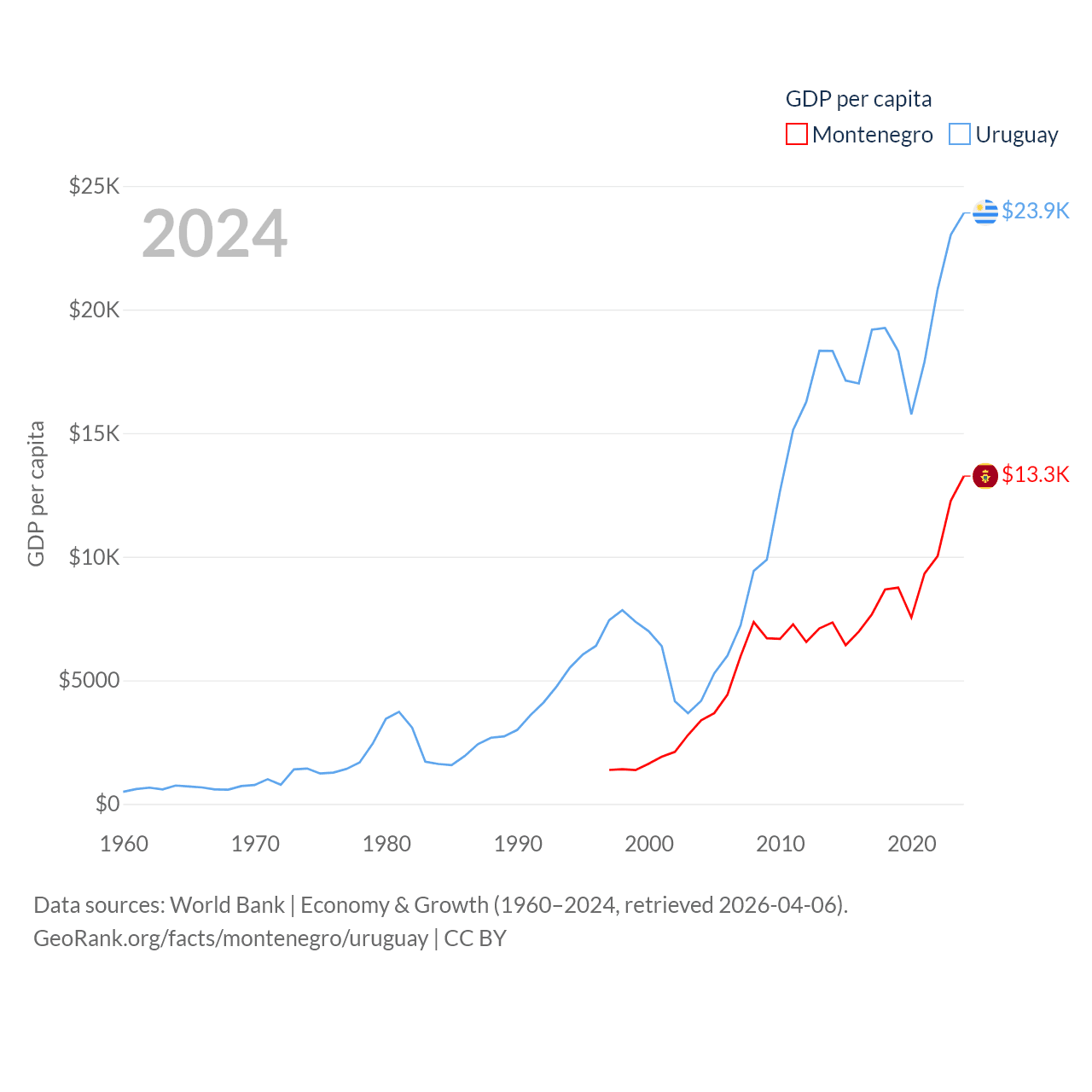 By GDP, Montenegro ranks 155/197 ($8.27B) and Uruguay ranks 81/197 ($81B). By GDP per capita, Montenegro ranks 77/197 ($13,263), while Uruguay ranks 52/197 ($23,907).