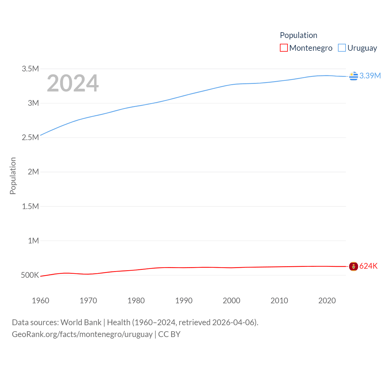 Montenegro has a population of 624K (ranked 166/197), compared with 3.39M in Uruguay (ranked 133/197). Montenegro's land area is 5,193 sq mi versus 67,576 sq mi for Uruguay (ranked 156th vs. 89th).