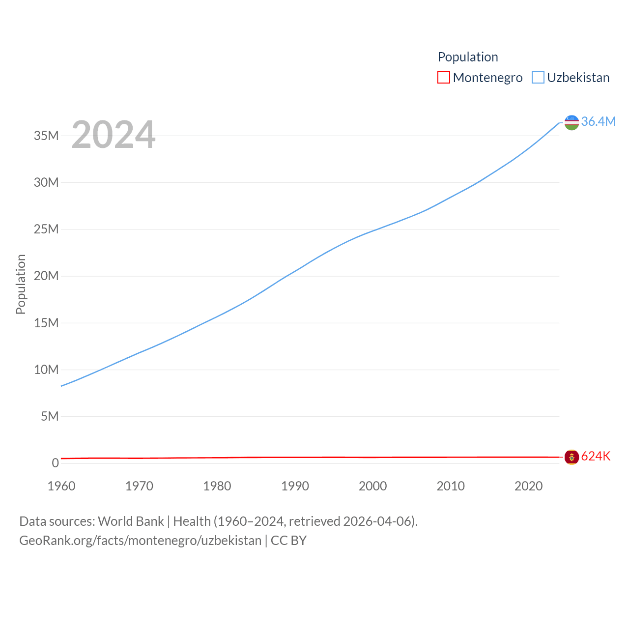 Montenegro has a population of 624K (ranked 166/197), compared with 36.4M in Uzbekistan (ranked 43/197). Montenegro's land area is 5,193 sq mi versus 170,136 sq mi for Uzbekistan (ranked 156th vs. 56th).