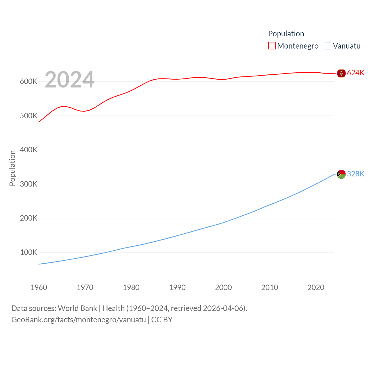 Montenegro has a population of 624K (ranked 166/197), compared with 328K in Vanuatu (ranked 174/197). Montenegro's land area is 5,193 sq mi versus 4,707 sq mi for Vanuatu (ranked 156th vs. 157th).