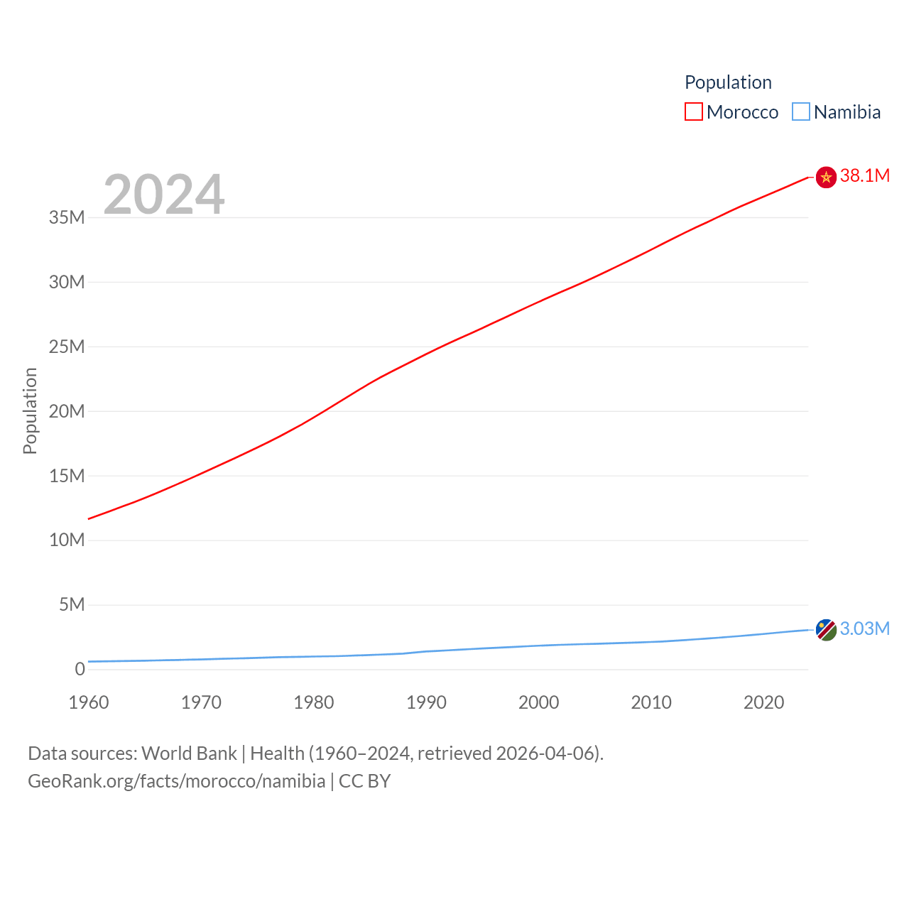 Morocco has a population of 38.1M (ranked 39/197), compared with 3.03M in Namibia (ranked 136/197). Morocco's land area is 172,317 sq mi versus 317,874 sq mi for Namibia (ranked 55th vs. 33rd).