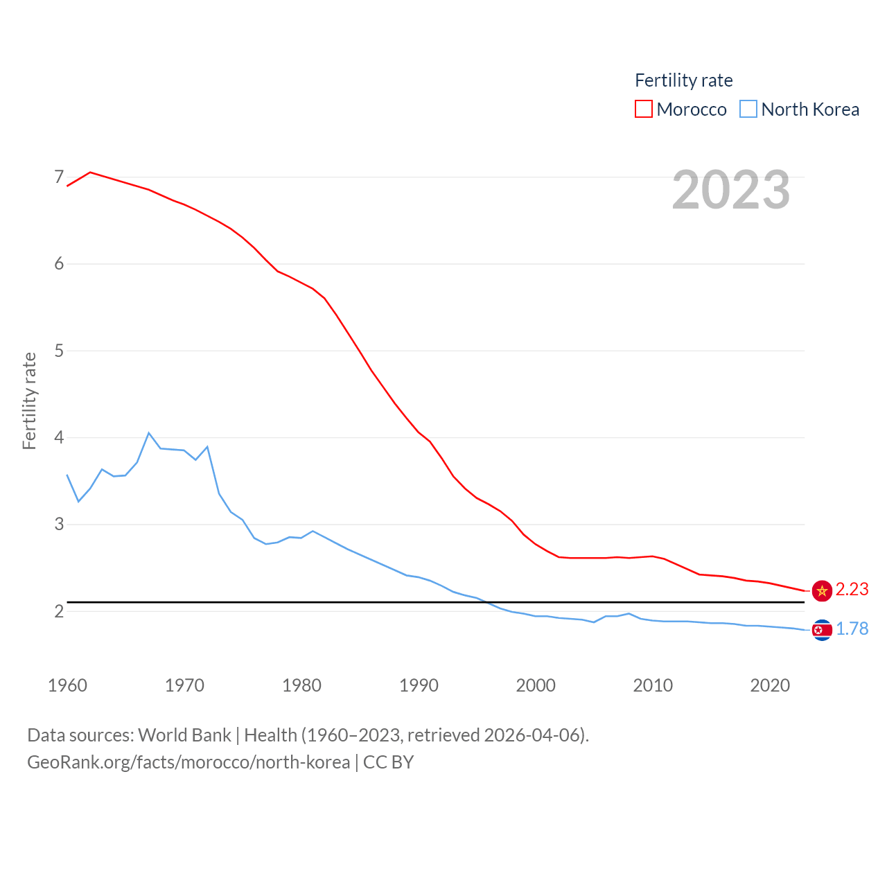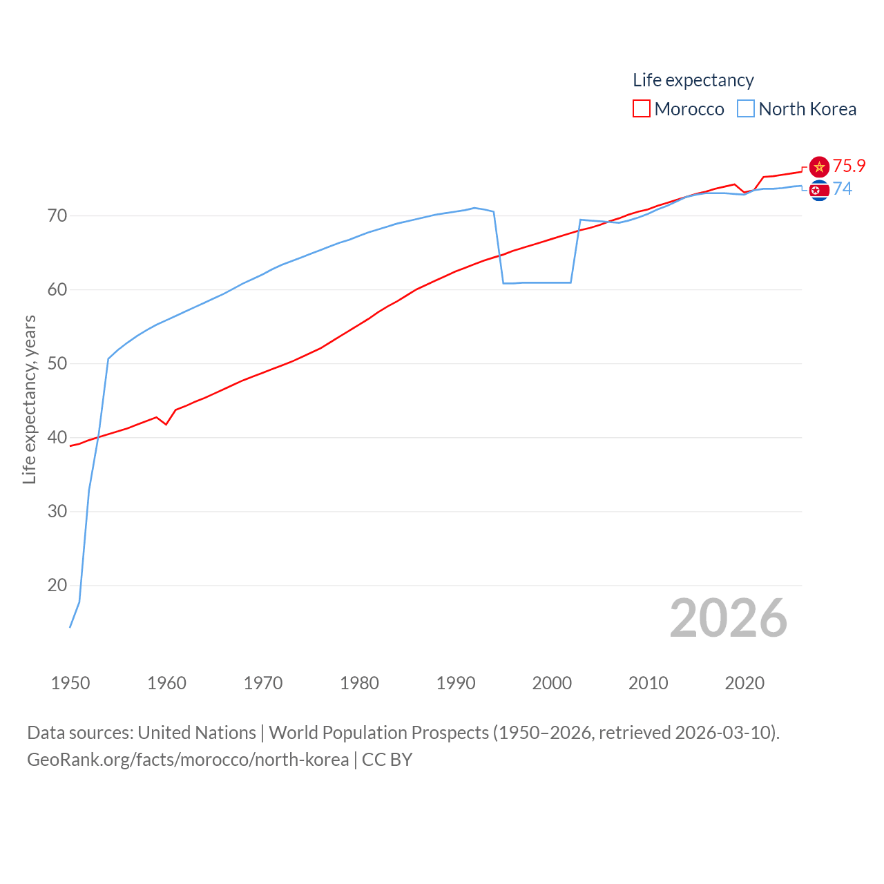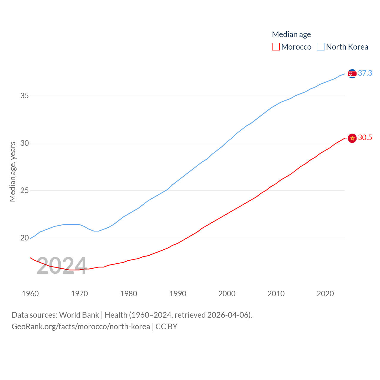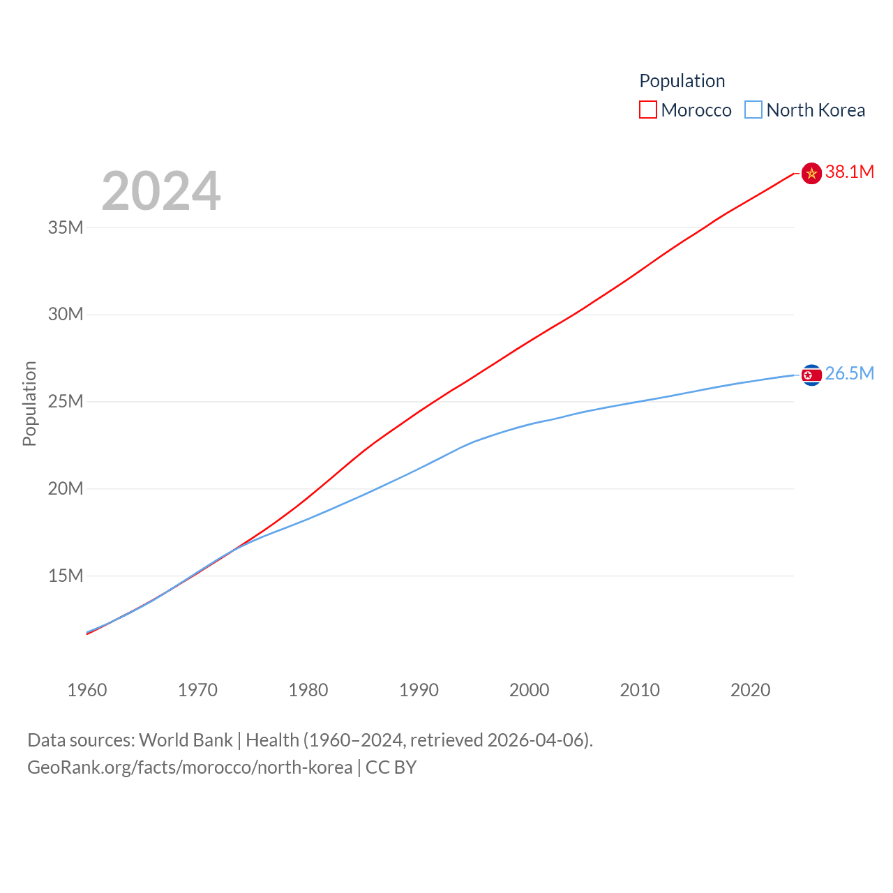 Morocco has a population of 38.1M (ranked 39/197), compared with 26.5M in North Korea (ranked 56/197). Morocco's land area is 172,317 sq mi versus 46,491 sq mi for North Korea (ranked 55th vs. 97th).