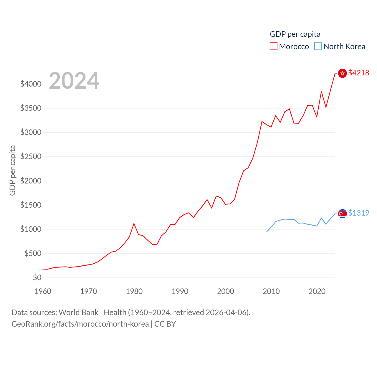By GDP, Morocco ranks 58/197 ($161B) and North Korea ranks 106/197 ($34.9B). By GDP per capita, Morocco ranks 127/197 ($4,218), while North Korea ranks 168/197 ($1,319).