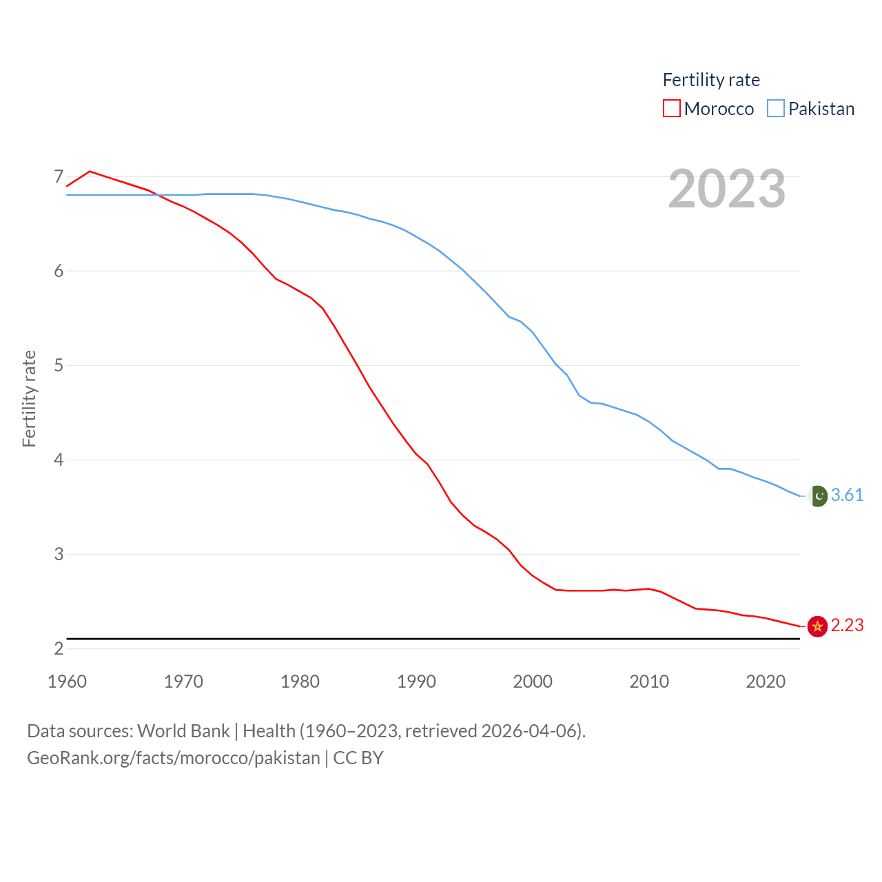 Morocco has a population of 38.1M (ranked 39/197), compared with 251M in Pakistan (ranked 5/197). Morocco's land area is 172,317 sq mi versus 297,638 sq mi for Pakistan (ranked 55th vs. 35th).