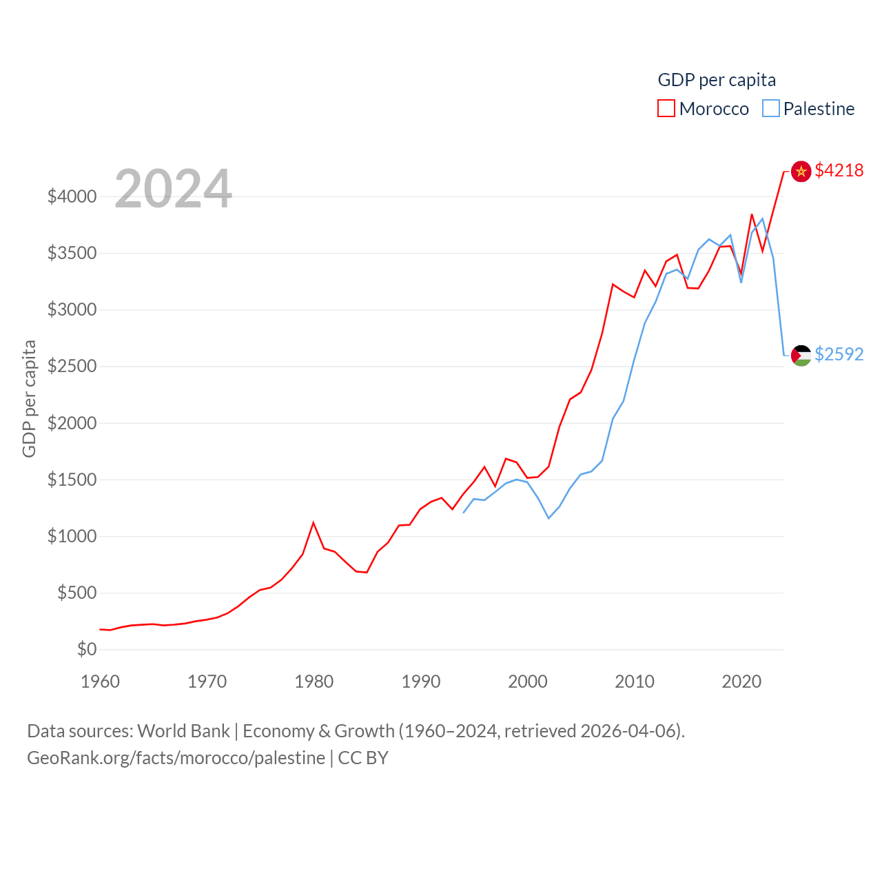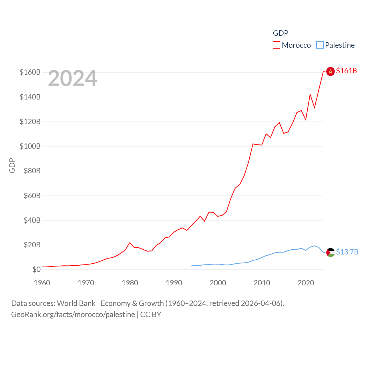 By GDP, Morocco ranks 58/197 ($161B) and Palestine ranks 146/197 ($13.7B). By GDP per capita, Morocco ranks 127/197 ($4,218), while Palestine ranks 147/197 ($2,592).