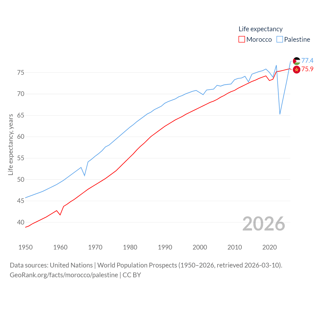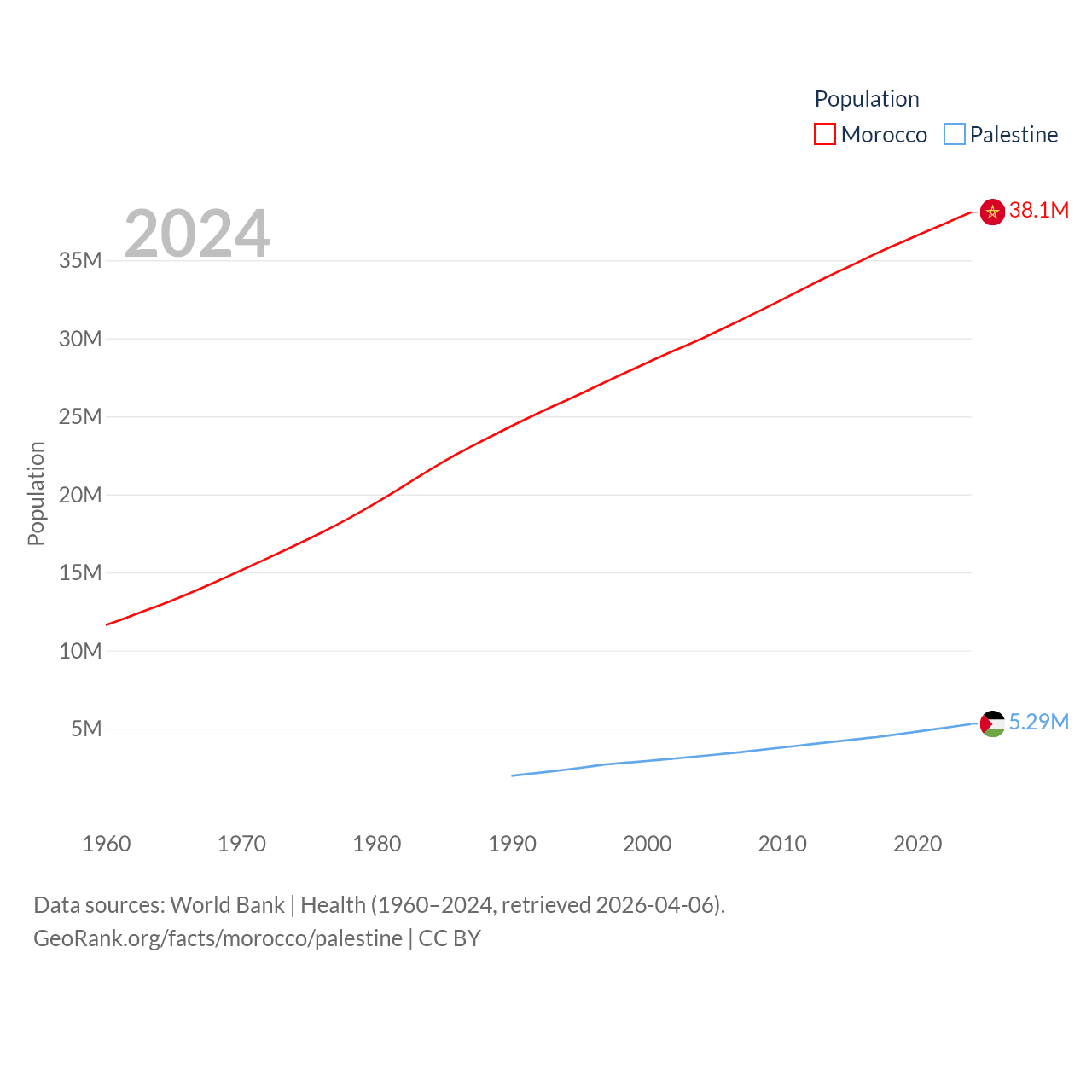 Morocco has a population of 38.1M (ranked 39/197), compared with 5.29M in Palestine (ranked 122/197). Morocco's land area is 172,317 sq mi versus 2,326 sq mi for Palestine (ranked 55th vs. 164th).