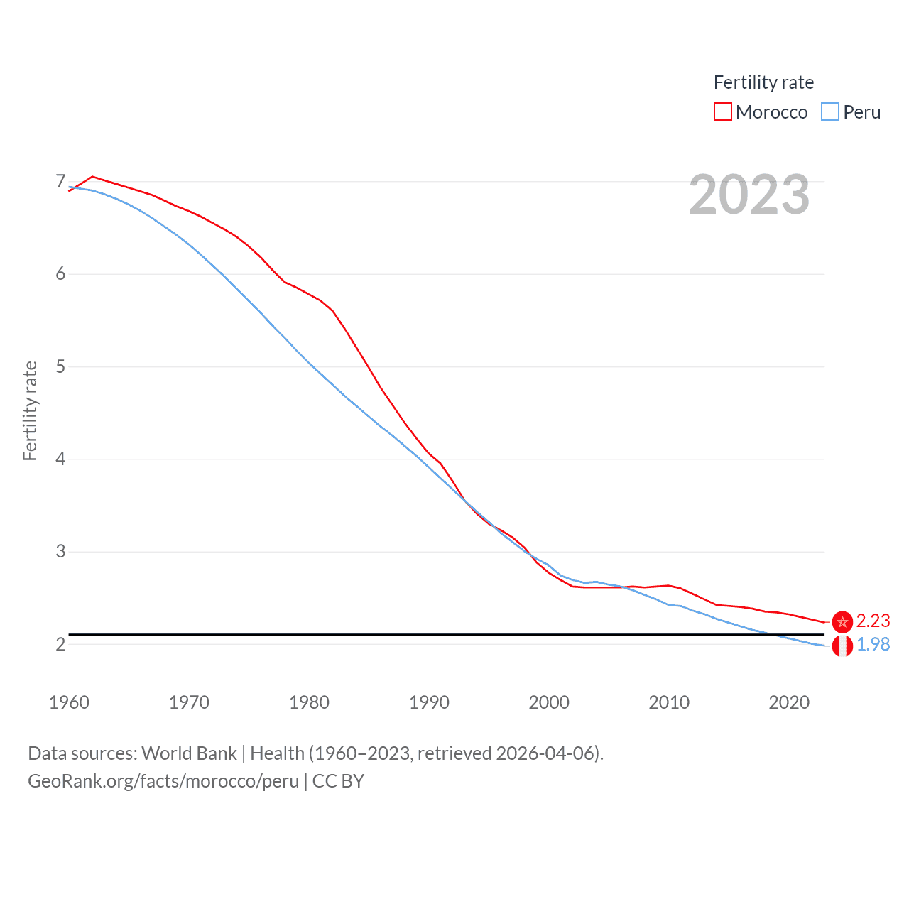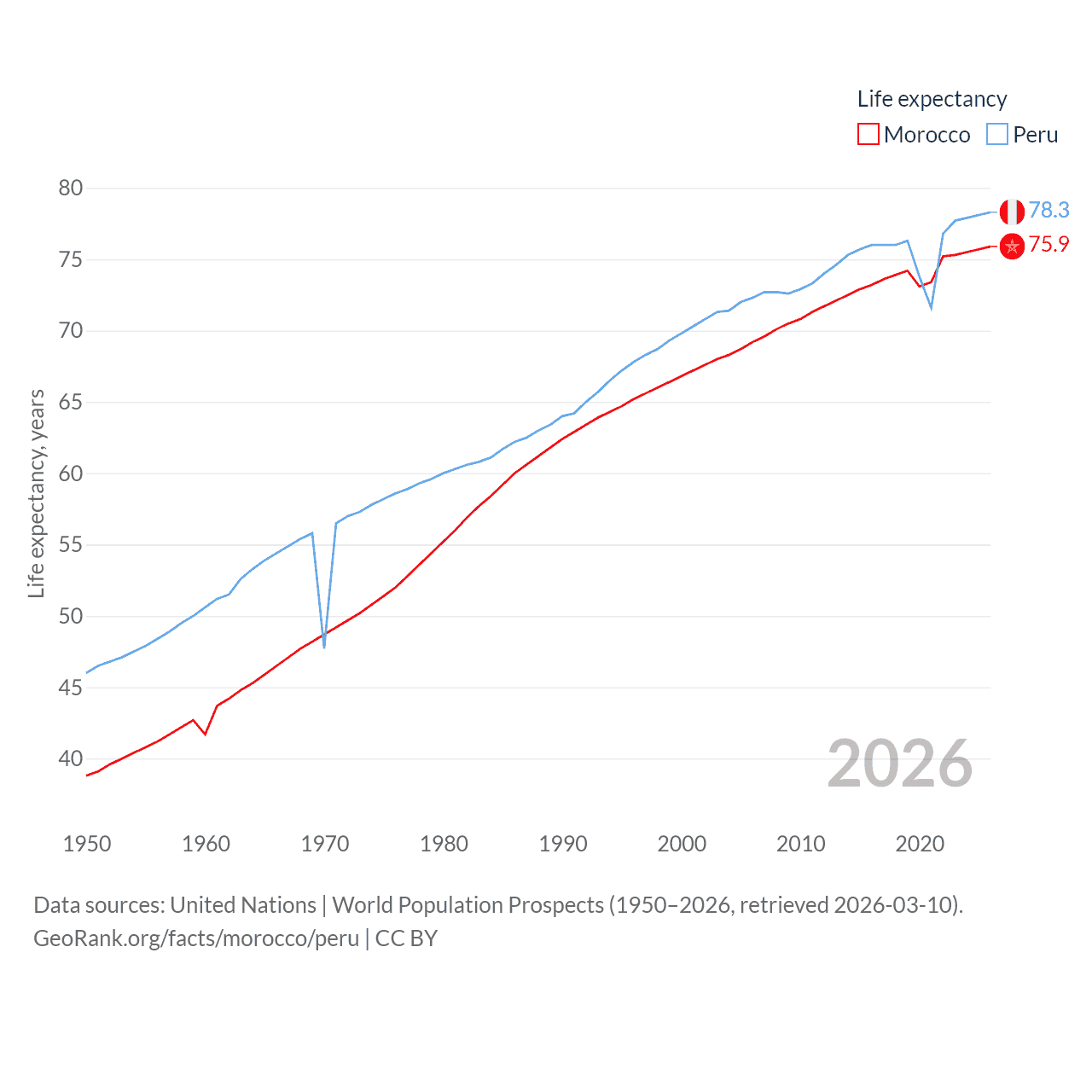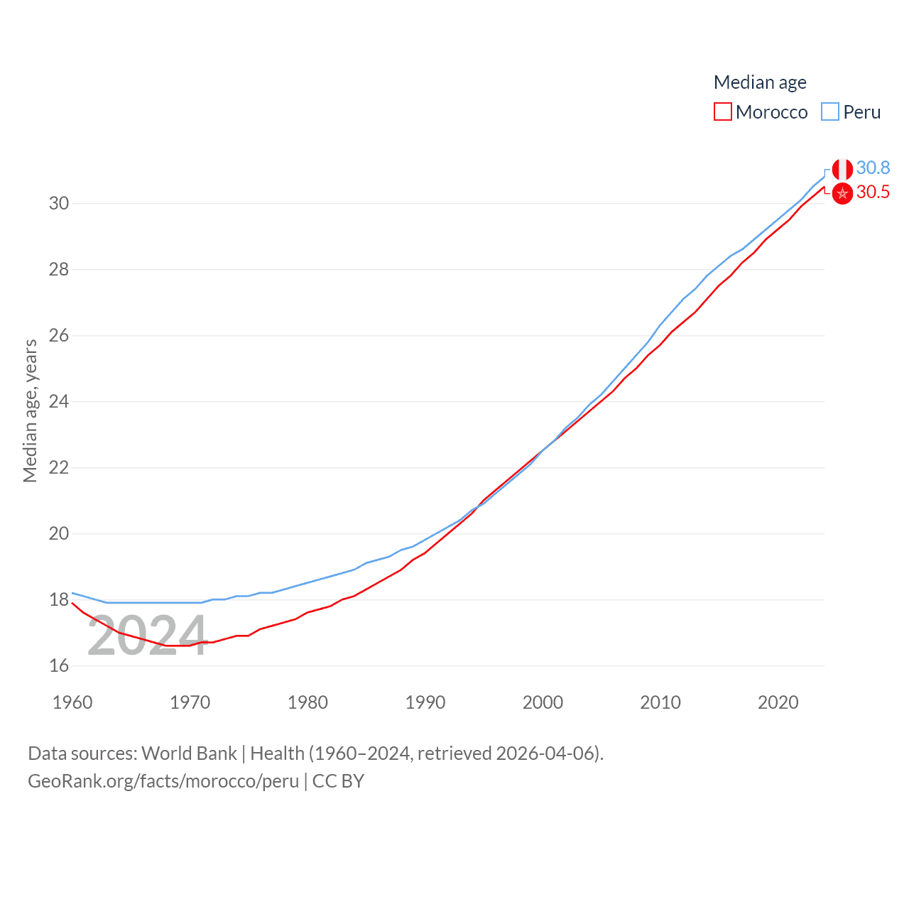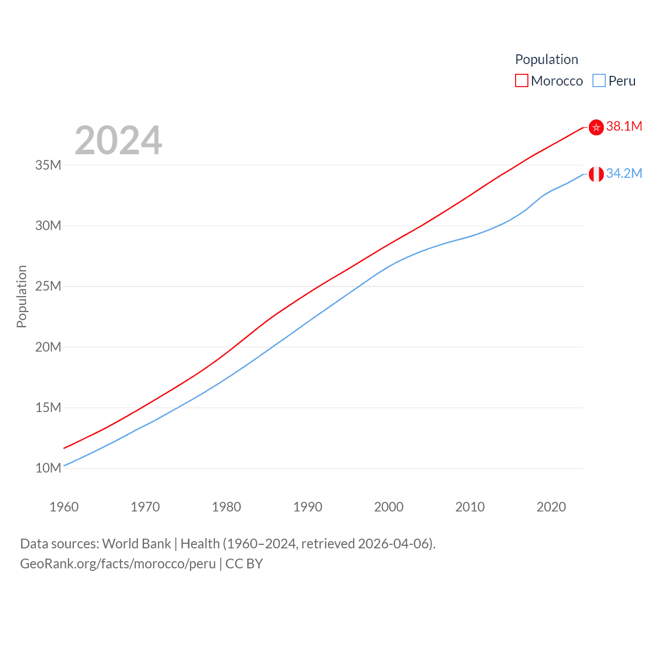 Morocco has a population of 38.1M (ranked 39/197), compared with 34.2M in Peru (ranked 48/197). Morocco's land area is 172,317 sq mi versus 494,211 sq mi for Peru (ranked 55th vs. 19th).