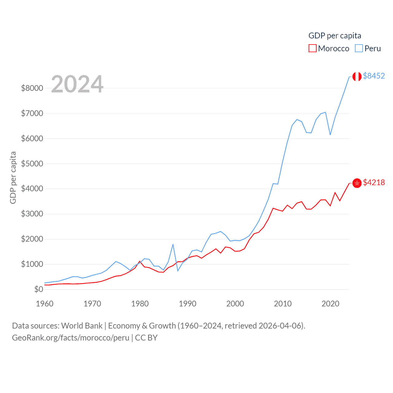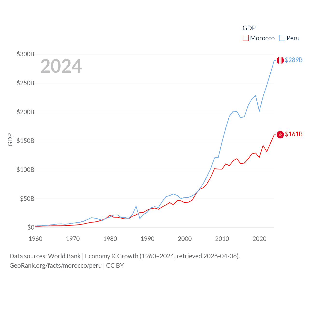 By GDP, Morocco ranks 58/197 ($161B) and Peru ranks 49/197 ($289B). By GDP per capita, Morocco ranks 127/197 ($4,218), while Peru ranks 91/197 ($8,452).