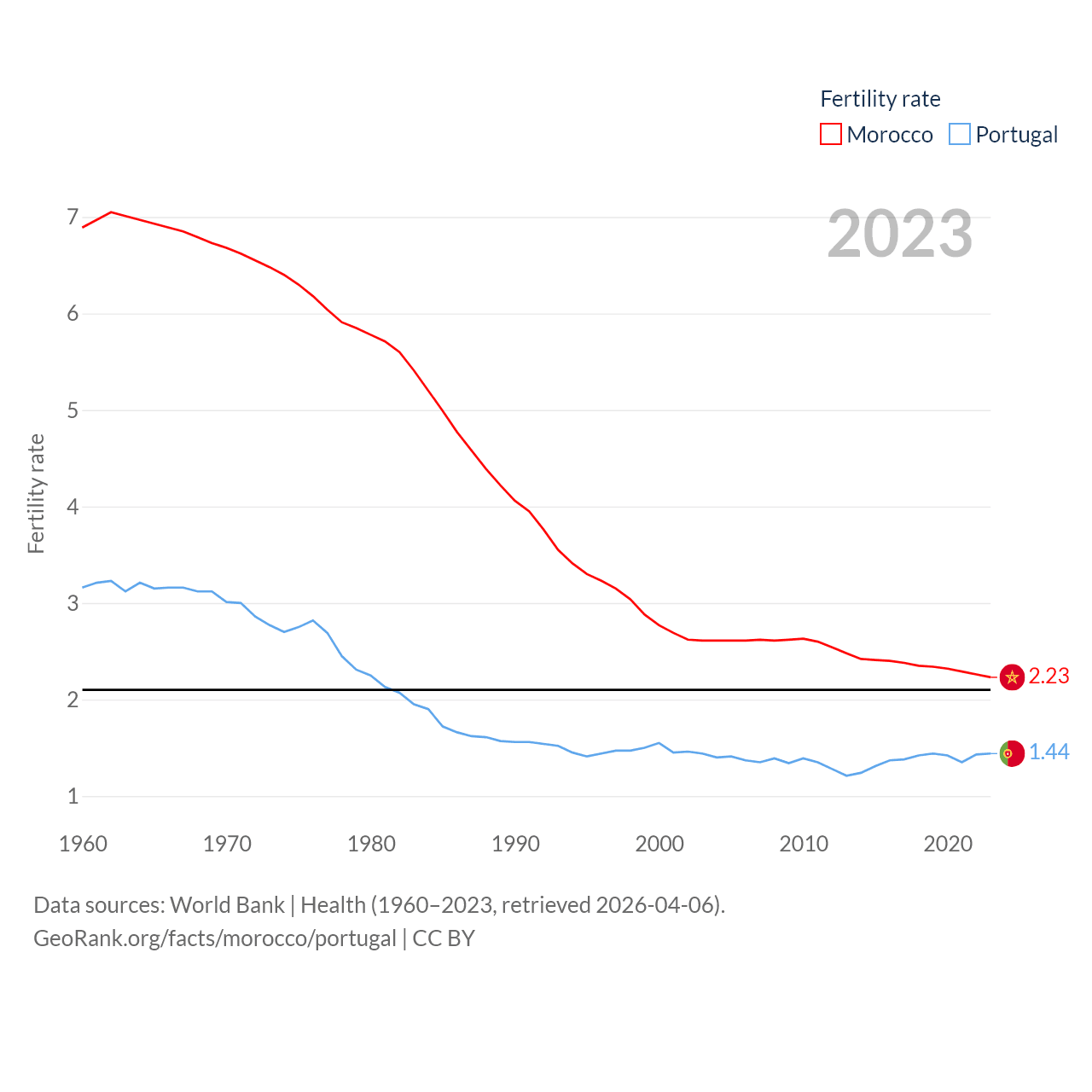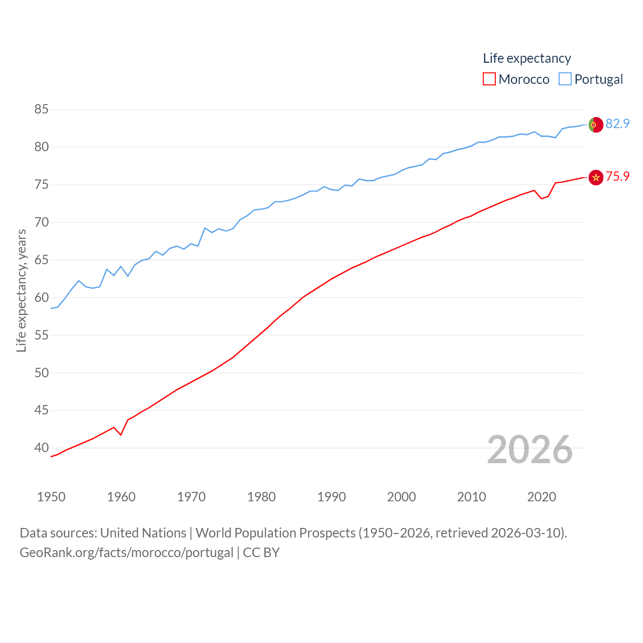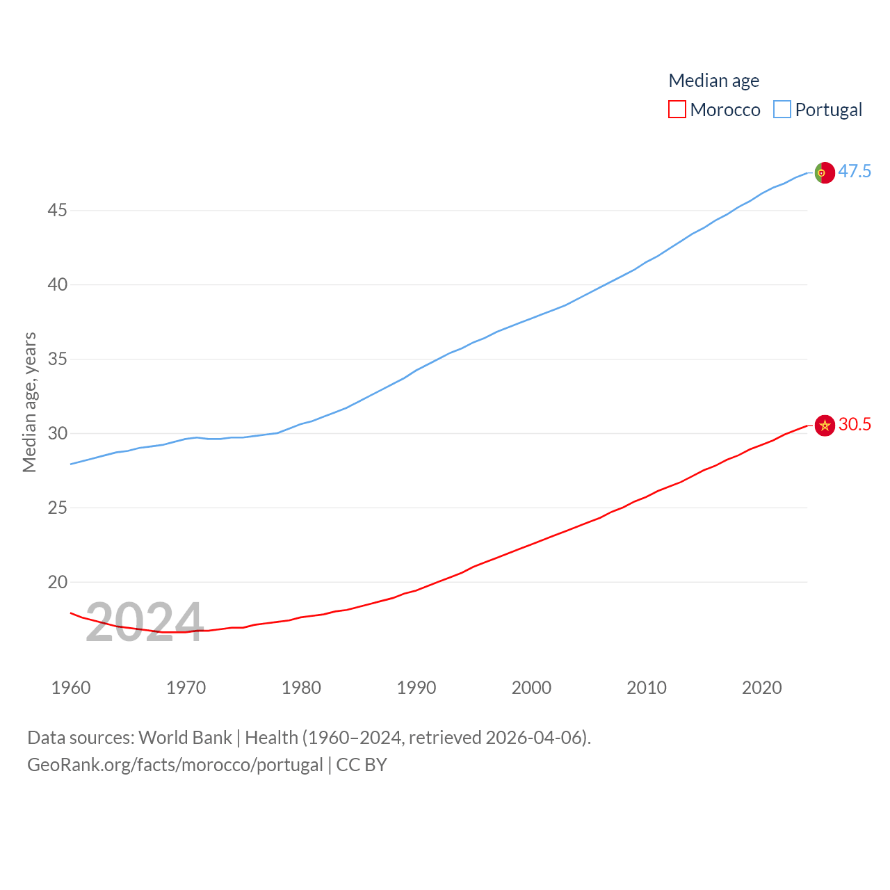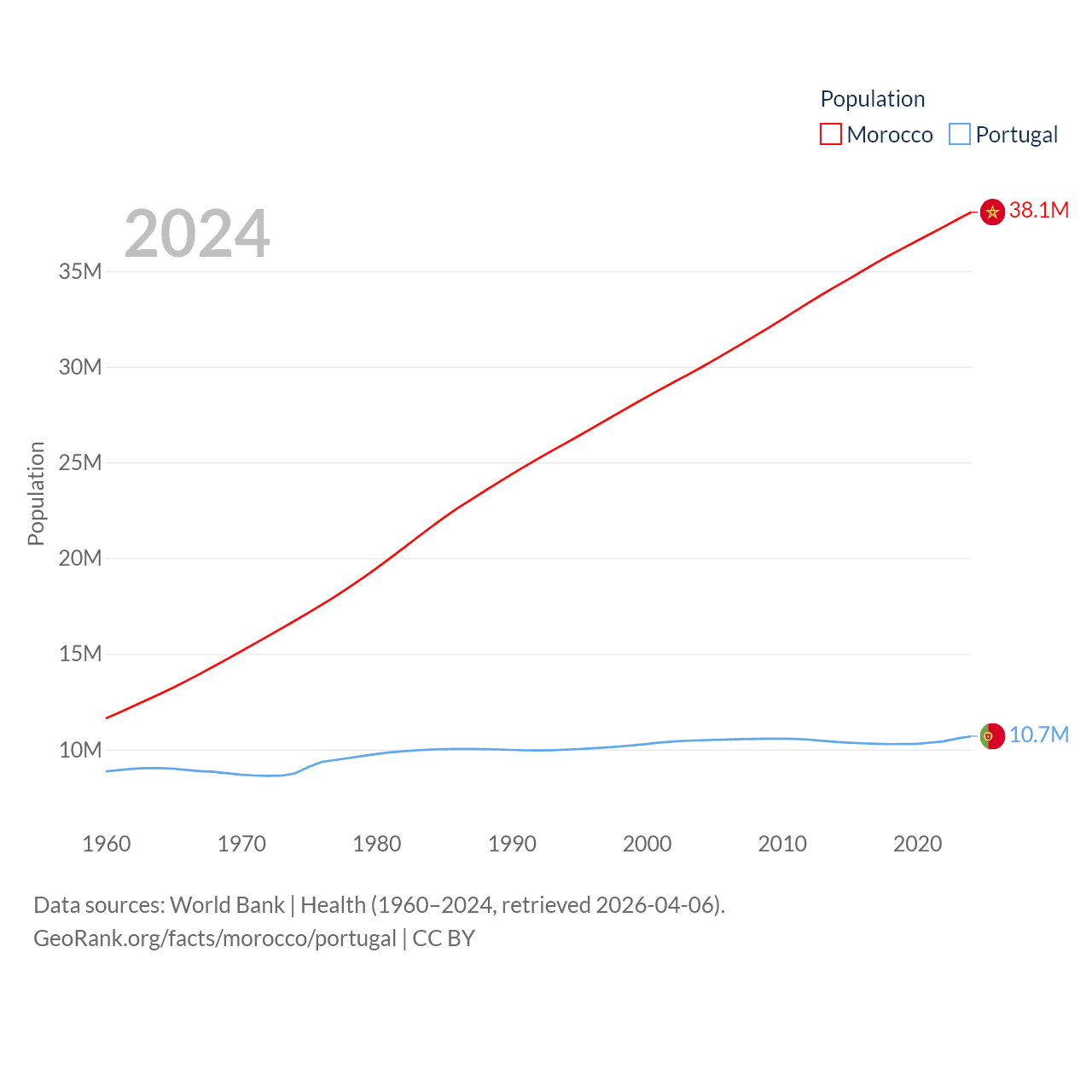Morocco has a population of 38.1M (ranked 39/197), compared with 10.7M in Portugal (ranked 90/197). Morocco's land area is 172,317 sq mi versus 35,369 sq mi for Portugal (ranked 55th vs. 108th).