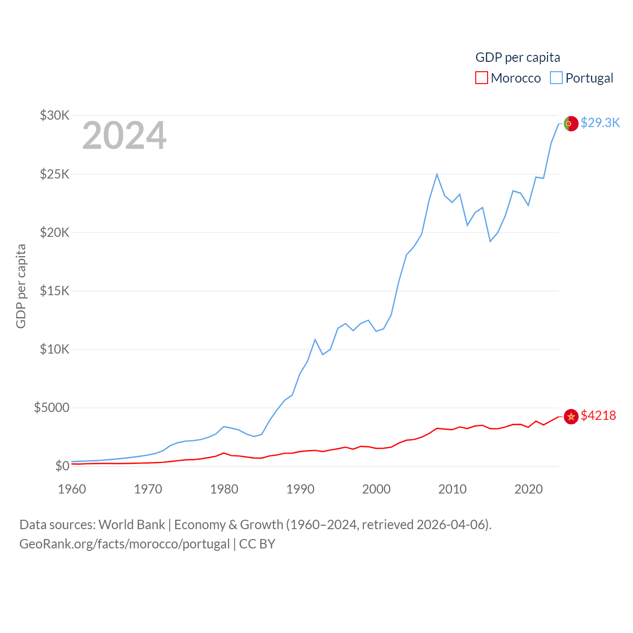By GDP, Morocco ranks 58/197 ($161B) and Portugal ranks 46/197 ($313B). By GDP per capita, Morocco ranks 127/197 ($4,218), while Portugal ranks 44/197 ($29,292).