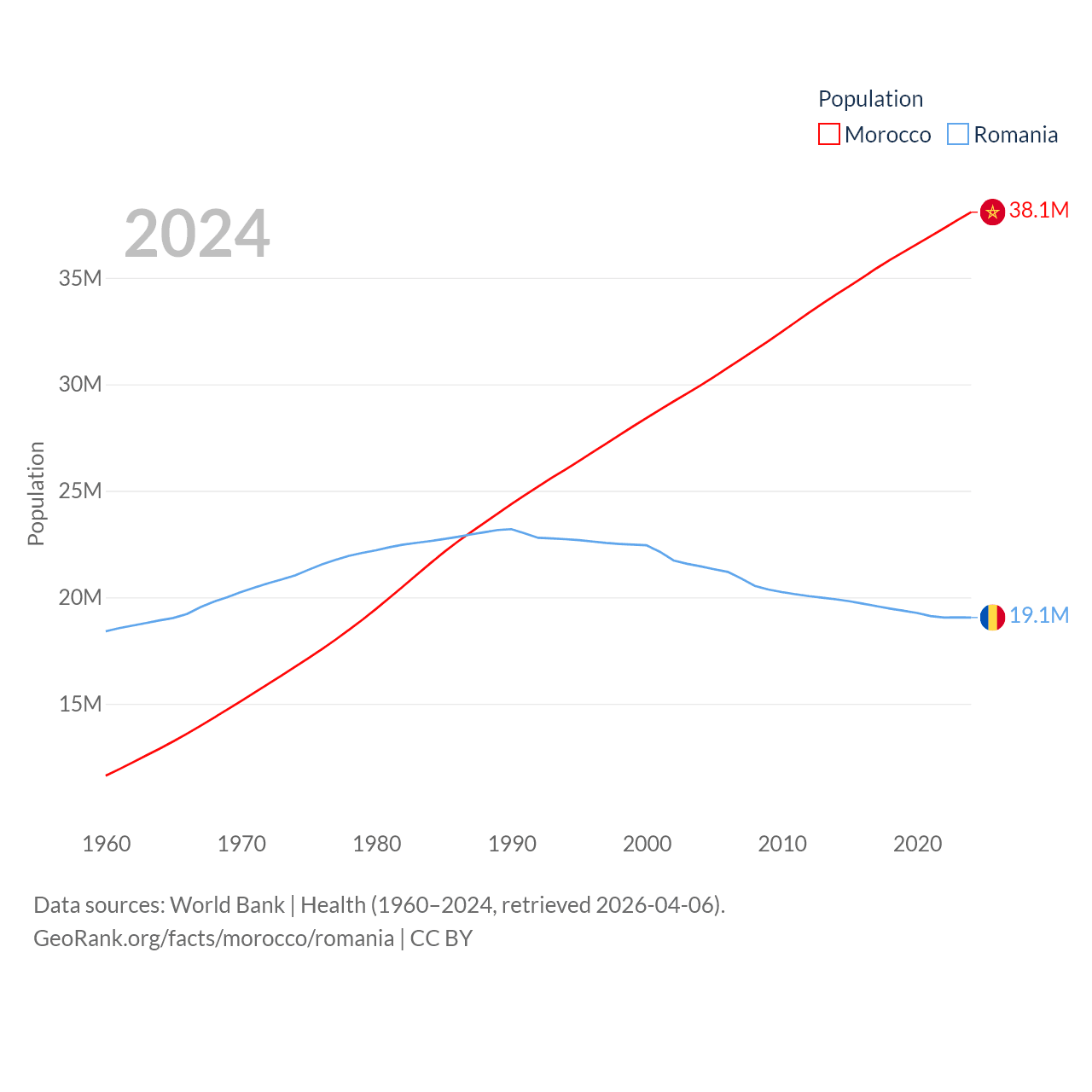 Morocco has a population of 38.1M (ranked 39/197), compared with 19.1M in Romania (ranked 67/197). Morocco's land area is 172,317 sq mi versus 88,834 sq mi for Romania (ranked 55th vs. 80th).