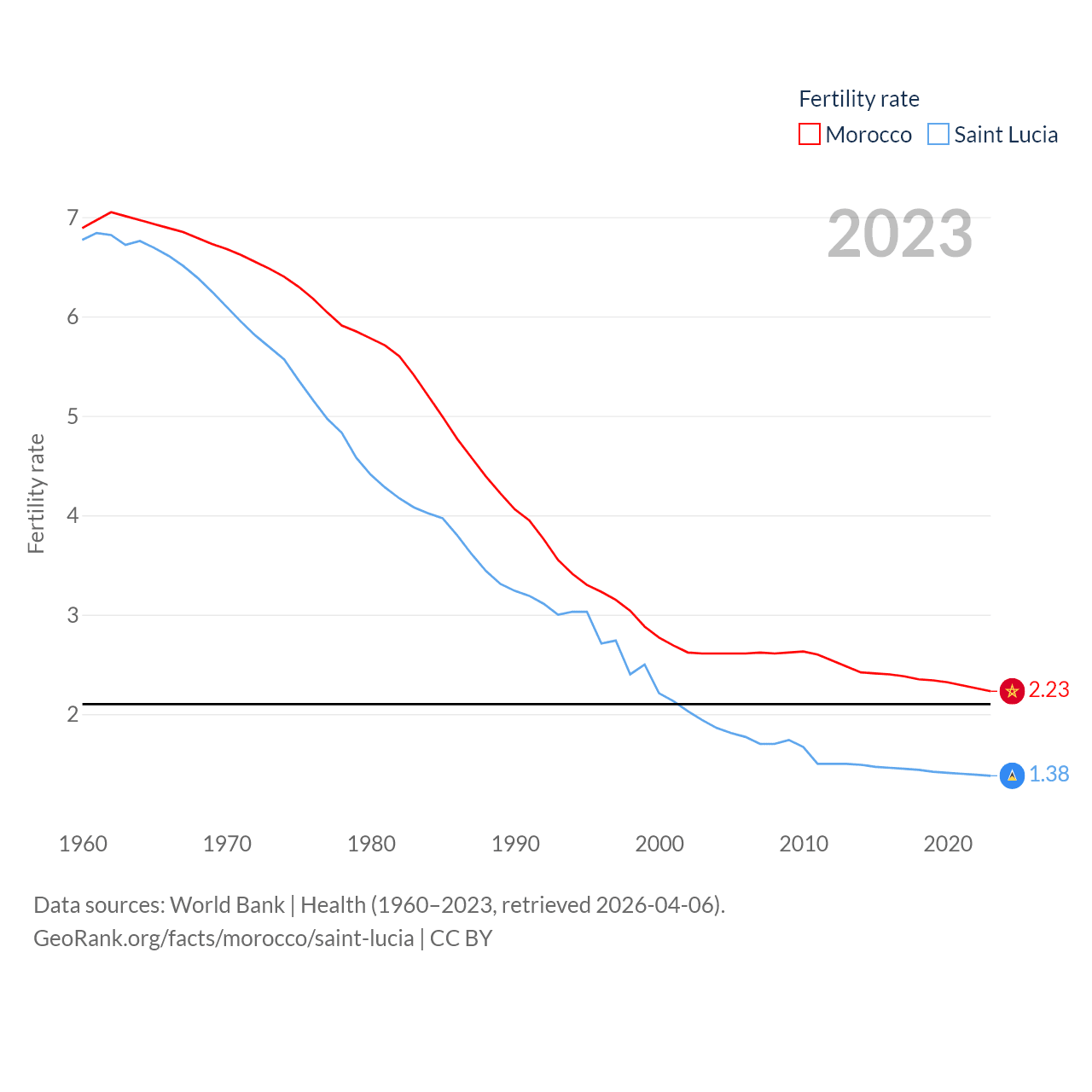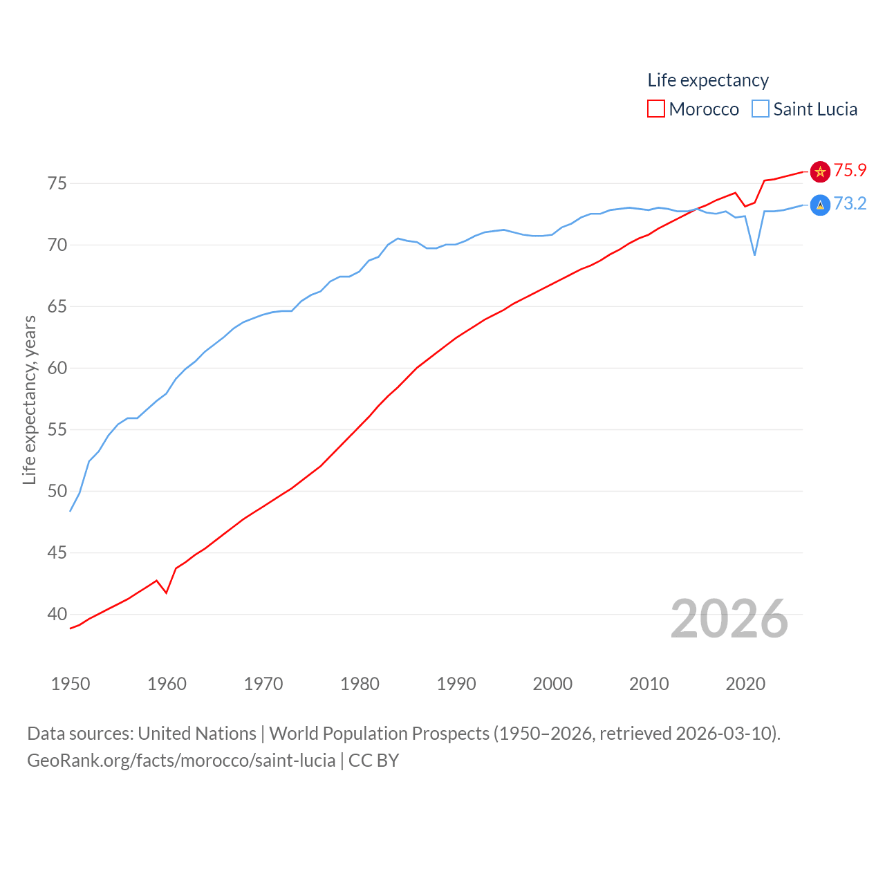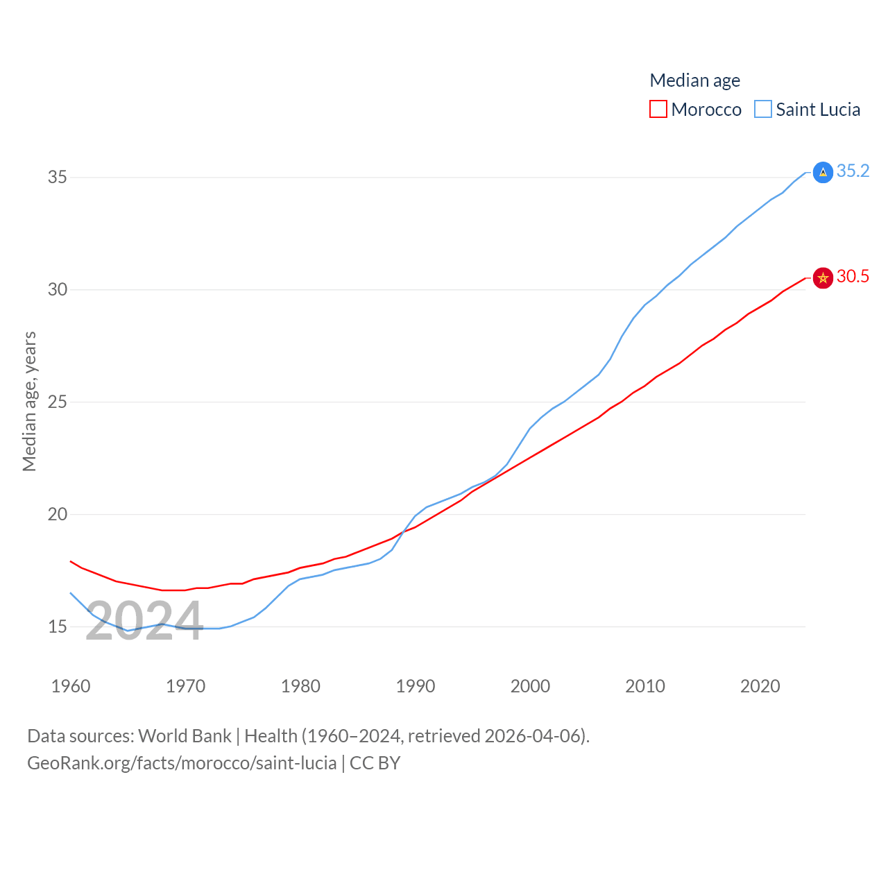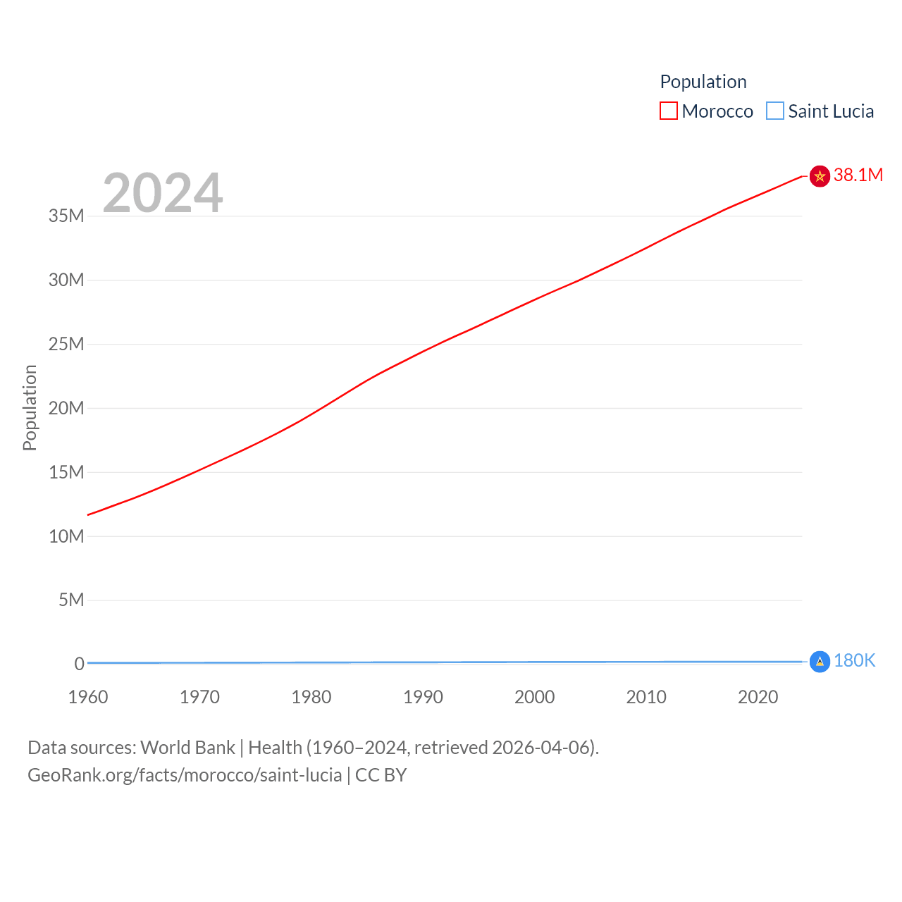 Morocco has a population of 38.1M (ranked 39/197), compared with 180K in Saint Lucia (ranked 178/197). Morocco's land area is 172,317 sq mi versus 235.5 sq mi for Saint Lucia (ranked 55th vs. 178th).