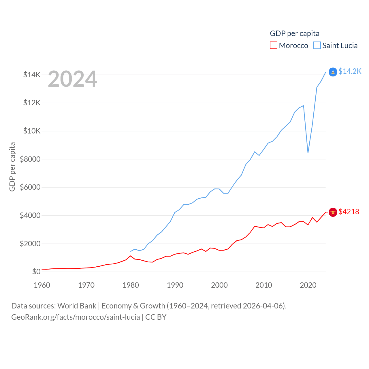 By GDP, Morocco ranks 58/197 ($161B) and Saint Lucia ranks 173/197 ($2.55B). By GDP per capita, Morocco ranks 127/197 ($4,218), while Saint Lucia ranks 70/197 ($14,182).