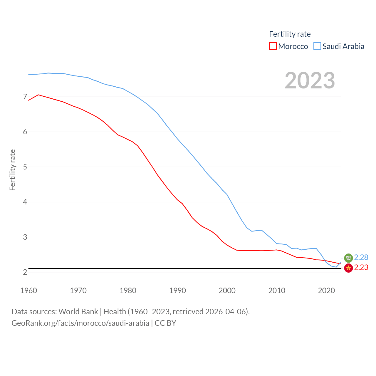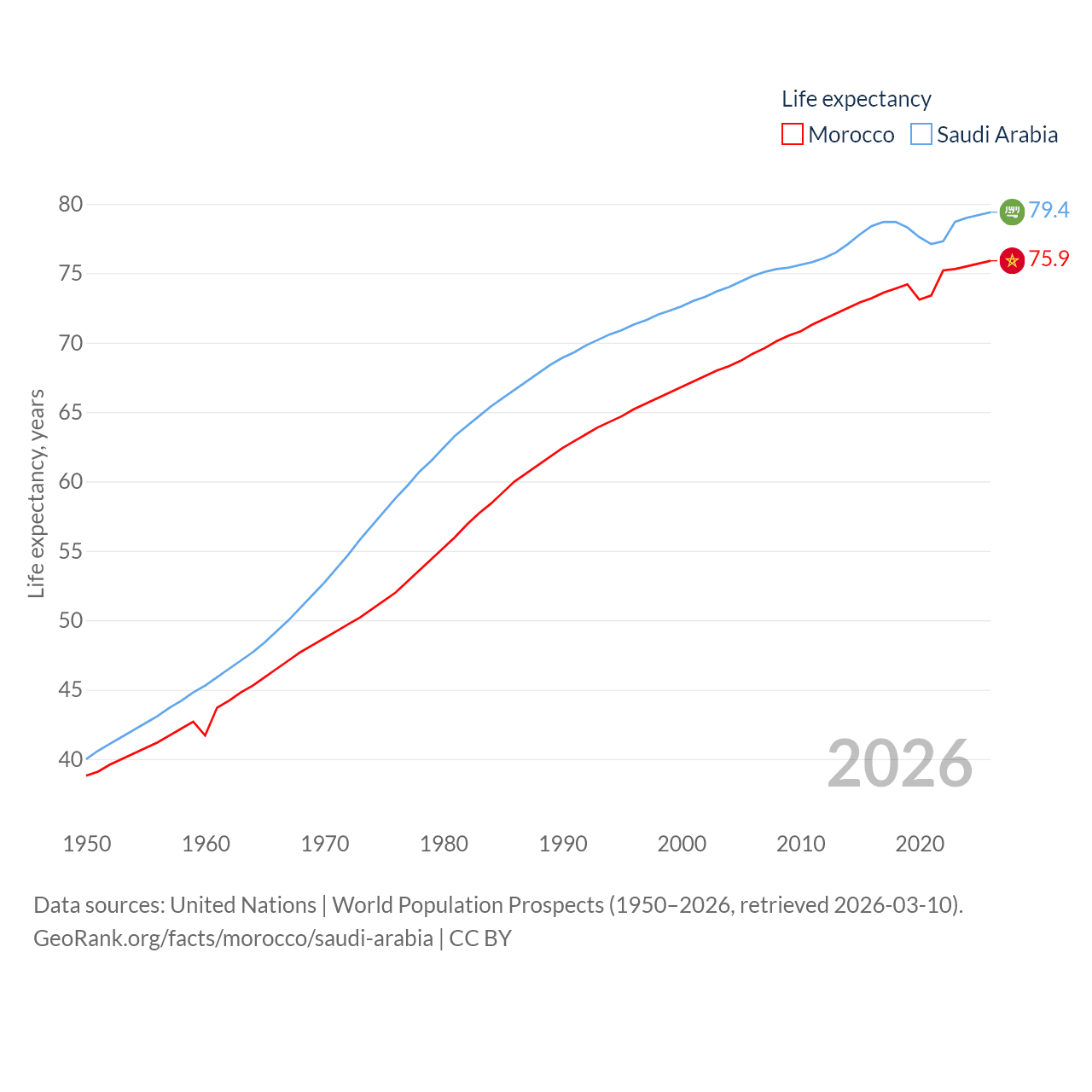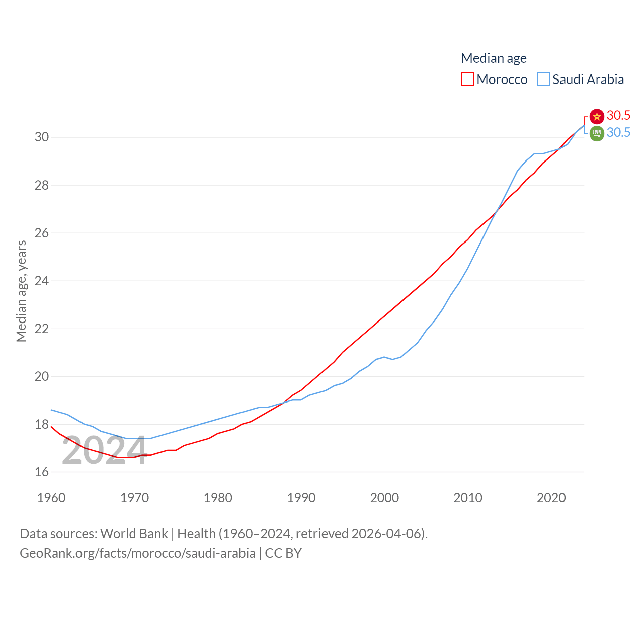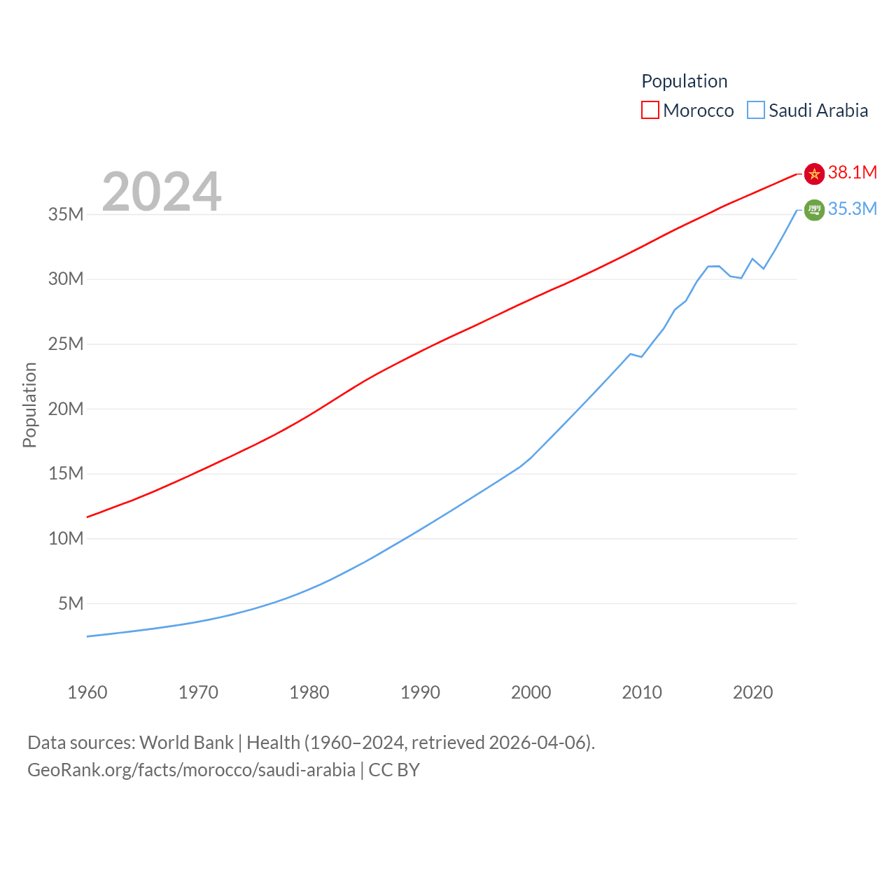 Morocco has a population of 38.1M (ranked 39/197), compared with 35.3M in Saudi Arabia (ranked 45/197). Morocco's land area is 172,317 sq mi versus 830,000 sq mi for Saudi Arabia (ranked 55th vs. 12th).
