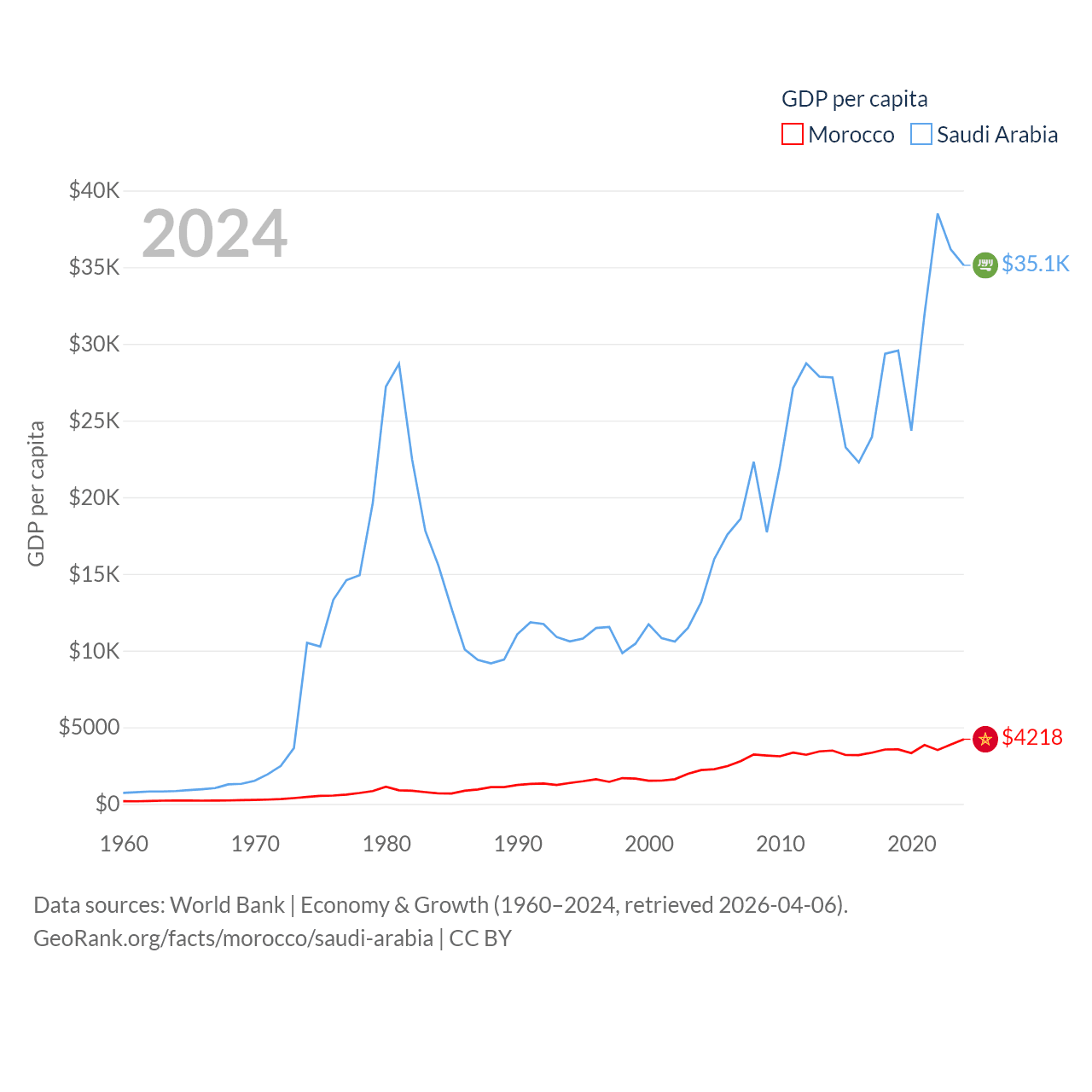 By GDP, Morocco ranks 58/197 ($161B) and Saudi Arabia ranks 18/197 ($1.24T). By GDP per capita, Morocco ranks 127/197 ($4,218), while Saudi Arabia ranks 33/197 ($35,122).