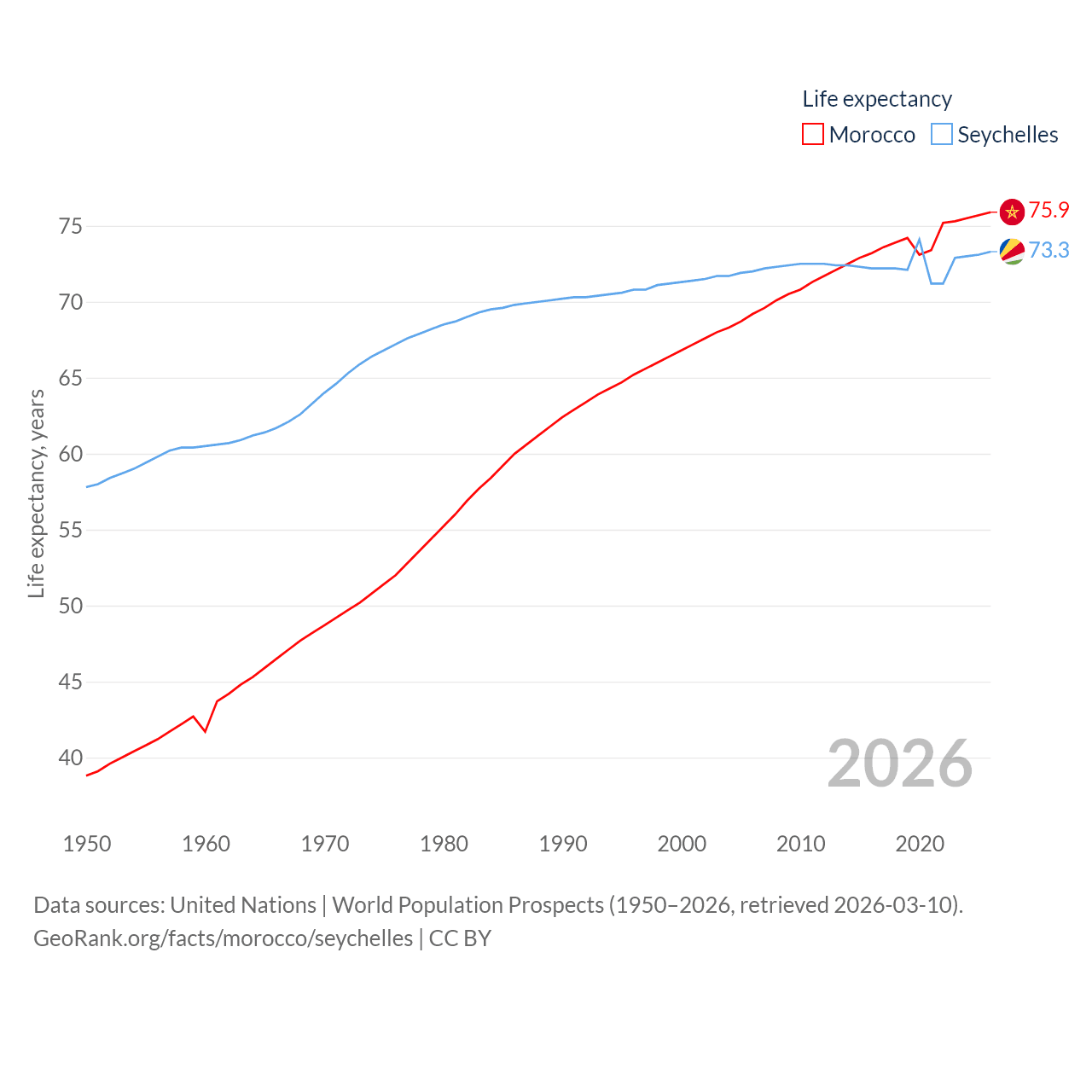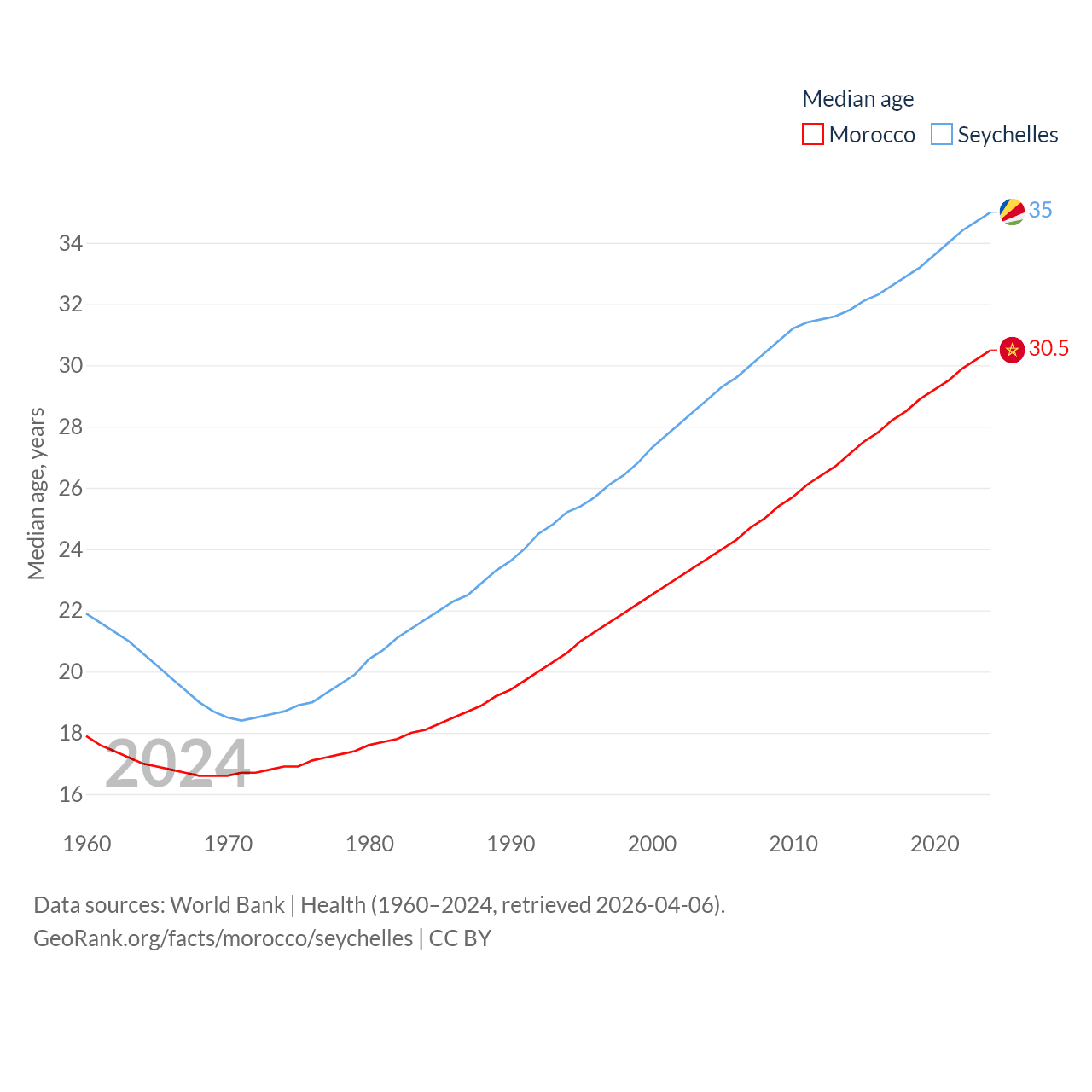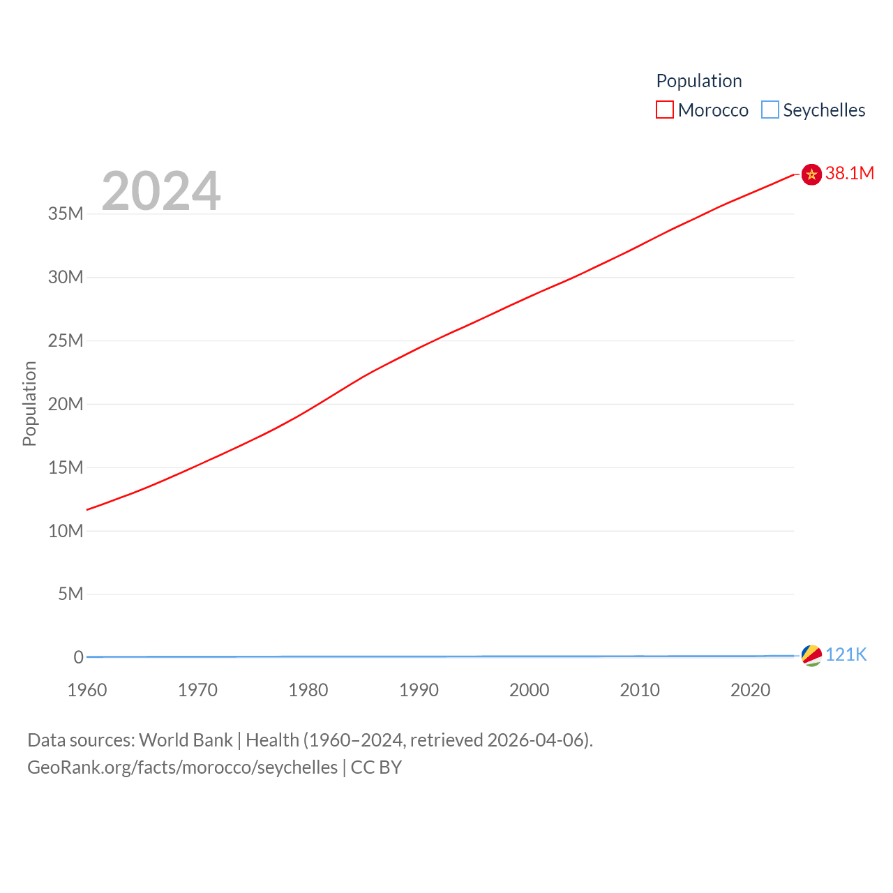 Morocco has a population of 38.1M (ranked 39/197), compared with 121K in The Seychelles (ranked 181/197). Morocco's land area is 172,317 sq mi versus 177.6 sq mi for The Seychelles (ranked 55th vs. 181st).