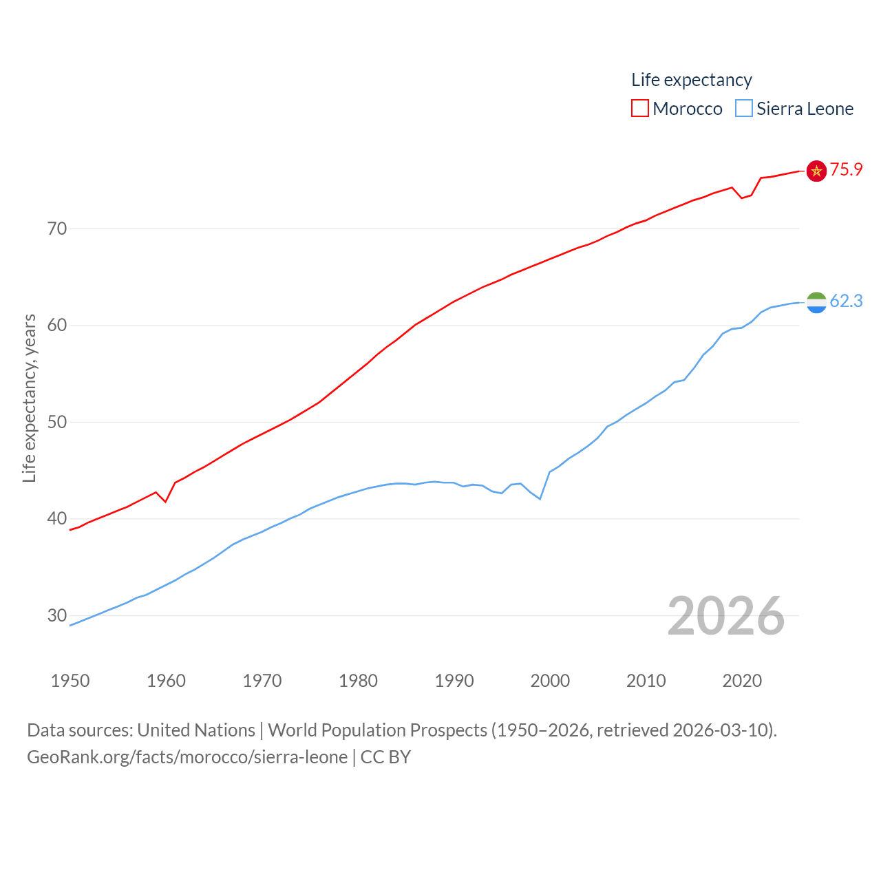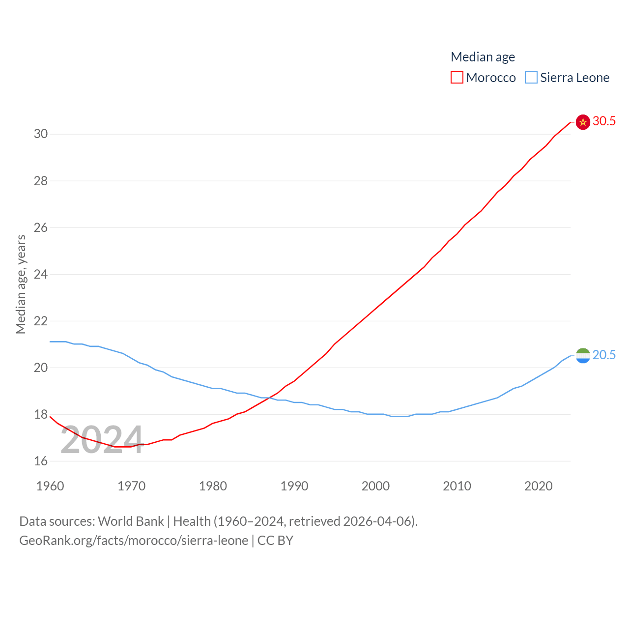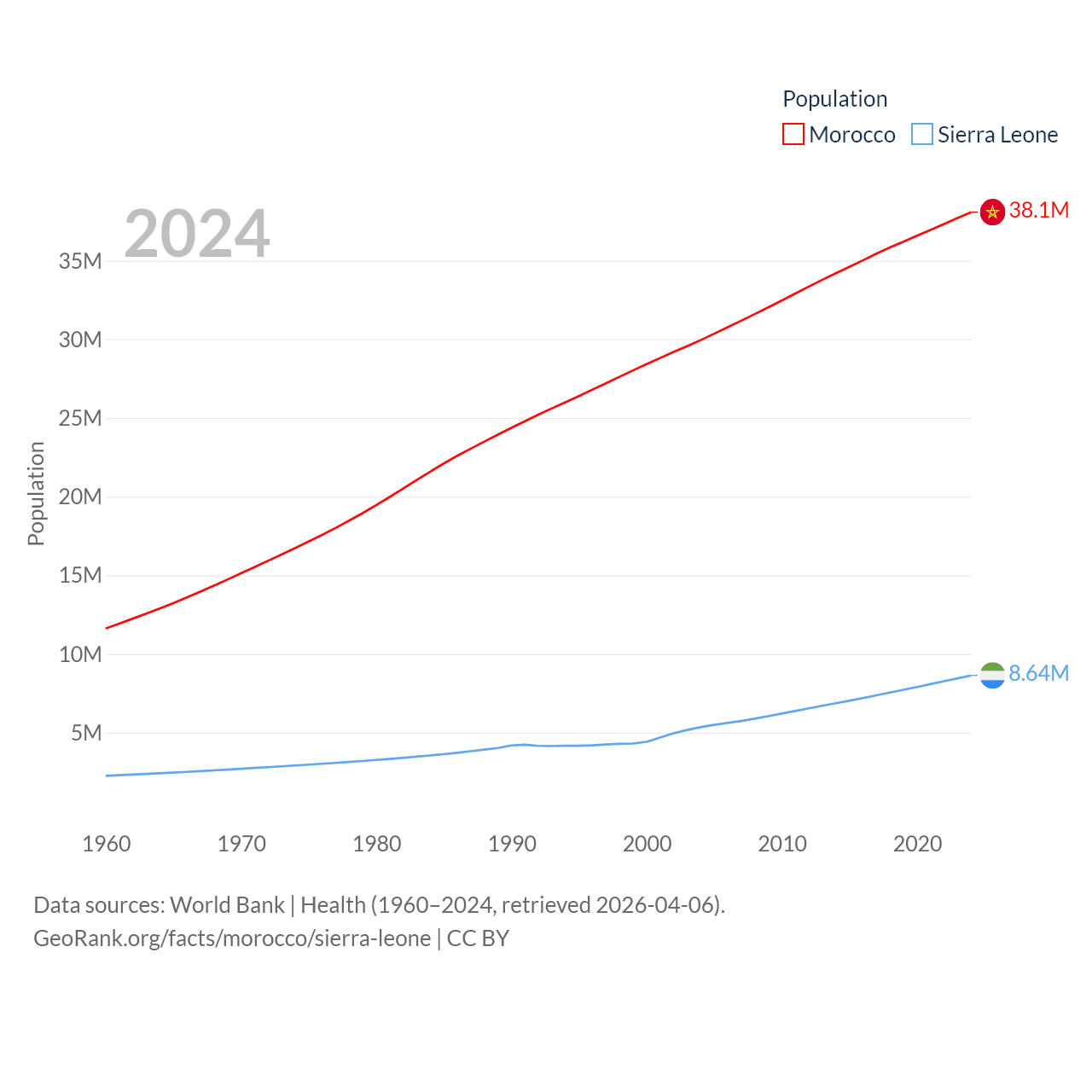Morocco has a population of 38.1M (ranked 39/197), compared with 8.64M in Sierra Leone (ranked 102/197). Morocco's land area is 172,317 sq mi versus 27,869 sq mi for Sierra Leone (ranked 55th vs. 116th).