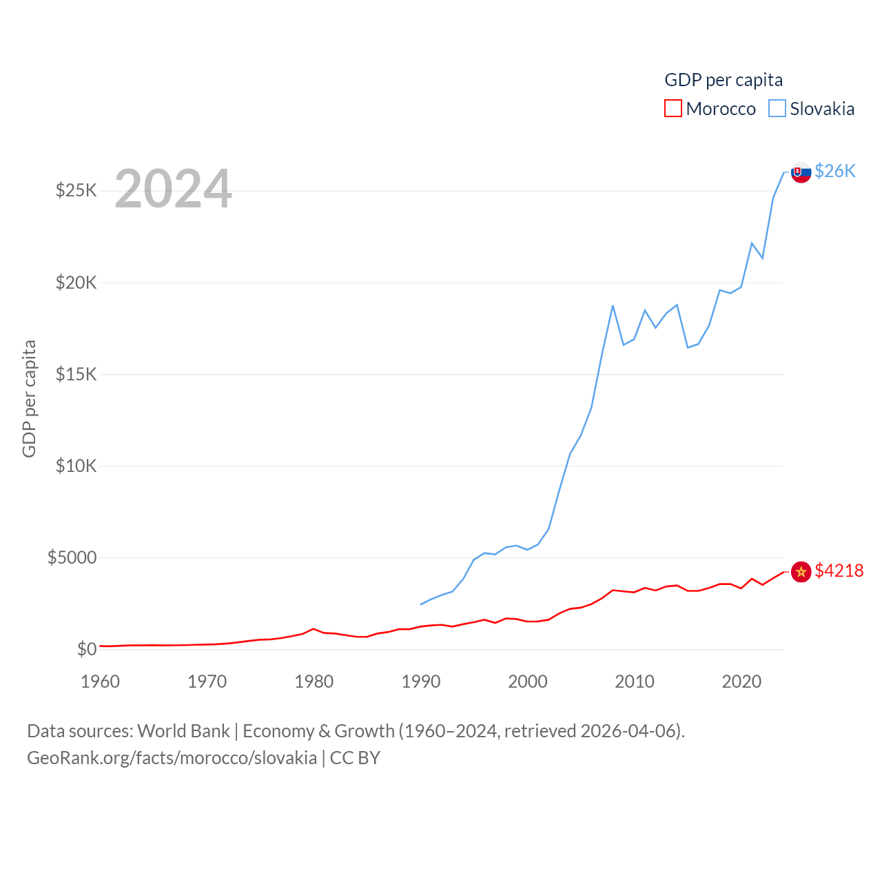 By GDP, Morocco ranks 58/197 ($161B) and Slovakia ranks 61/197 ($141B). By GDP per capita, Morocco ranks 127/197 ($4,218), while Slovakia ranks 47/197 ($25,993).