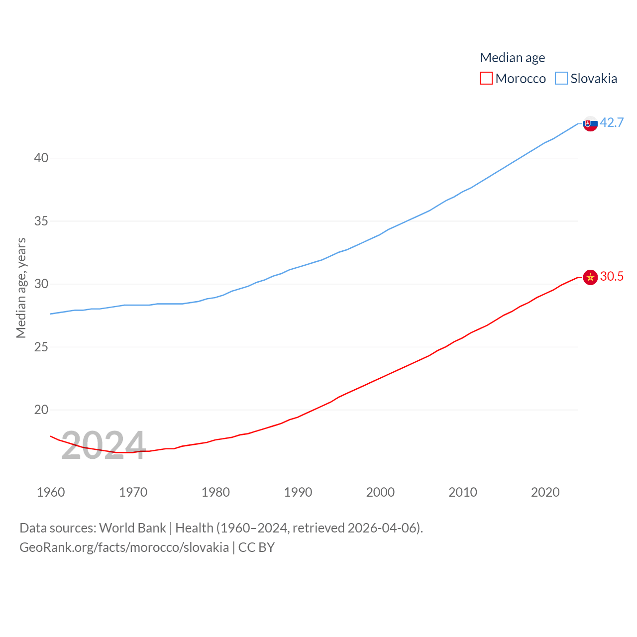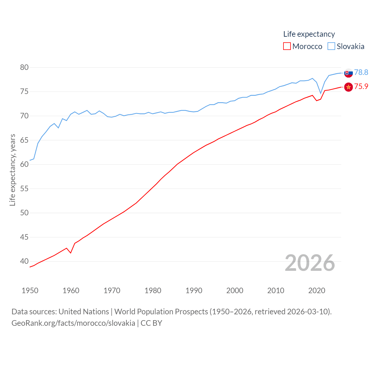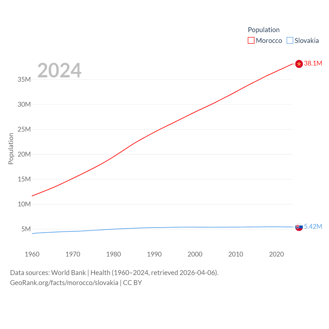 Morocco has a population of 38.1M (ranked 39/197), compared with 5.42M in Slovakia (ranked 119/197). Morocco's land area is 172,317 sq mi versus 18,564 sq mi for Slovakia (ranked 55th vs. 128th).