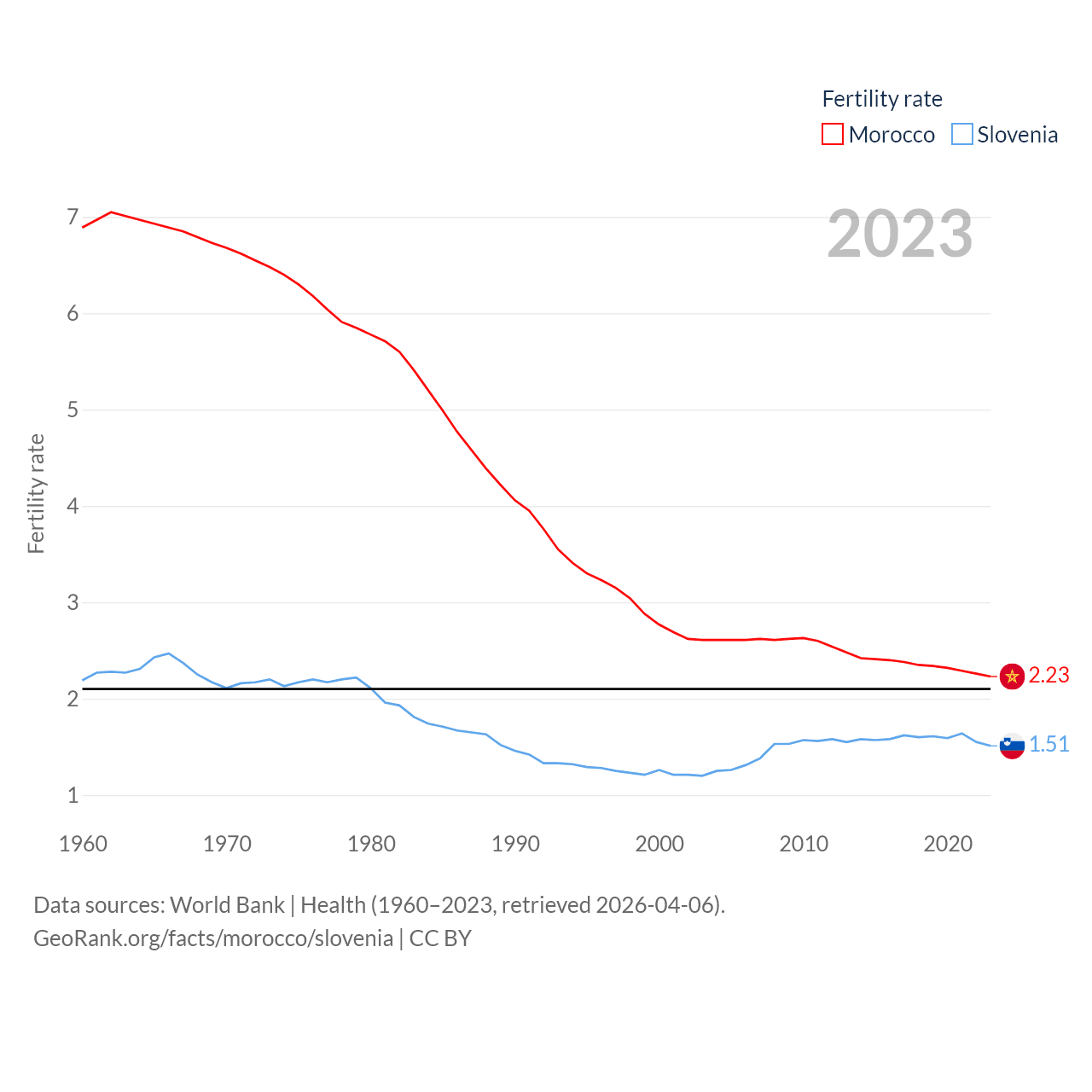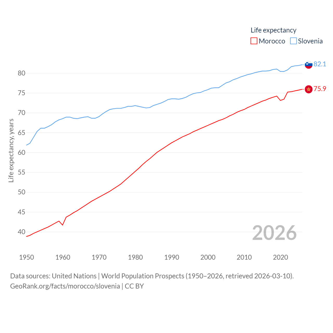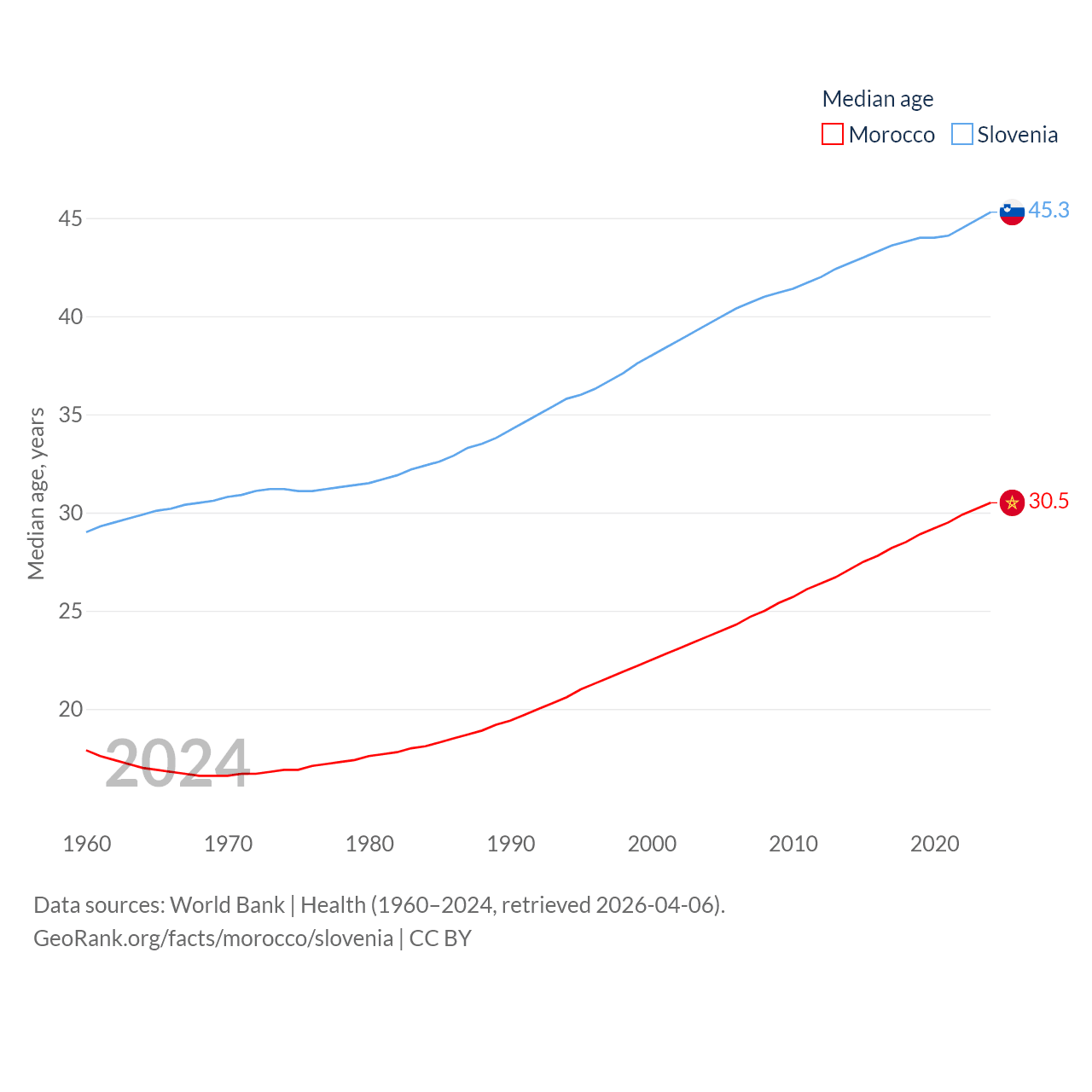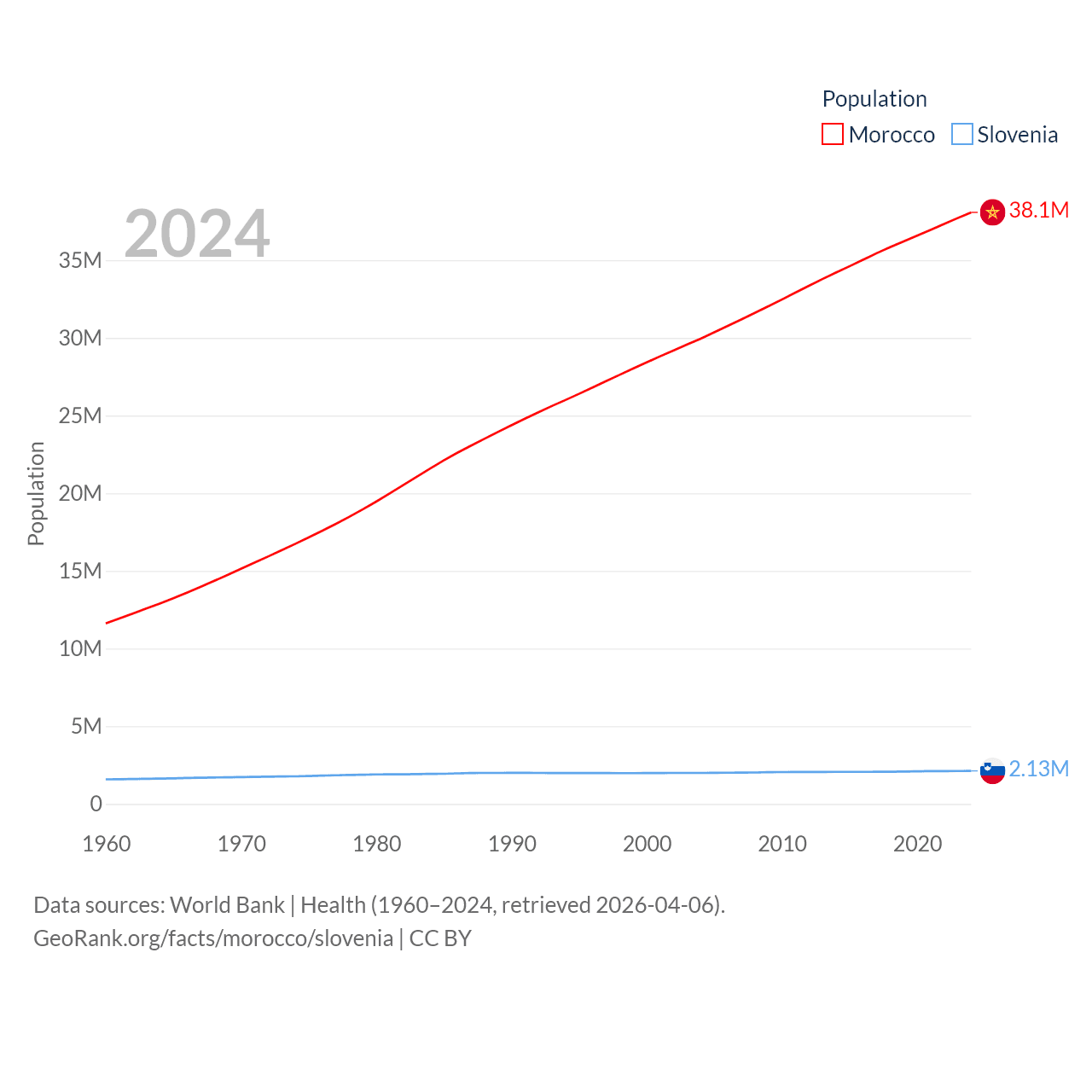 Morocco has a population of 38.1M (ranked 39/197), compared with 2.13M in Slovenia (ranked 147/197). Morocco's land area is 172,317 sq mi versus 7,774 sq mi for Slovenia (ranked 55th vs. 151st).