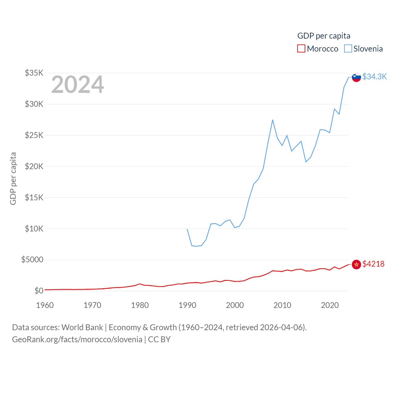 By GDP, Morocco ranks 58/197 ($161B) and Slovenia ranks 86/197 ($73B). By GDP per capita, Morocco ranks 127/197 ($4,218), while Slovenia ranks 34/197 ($34,301).