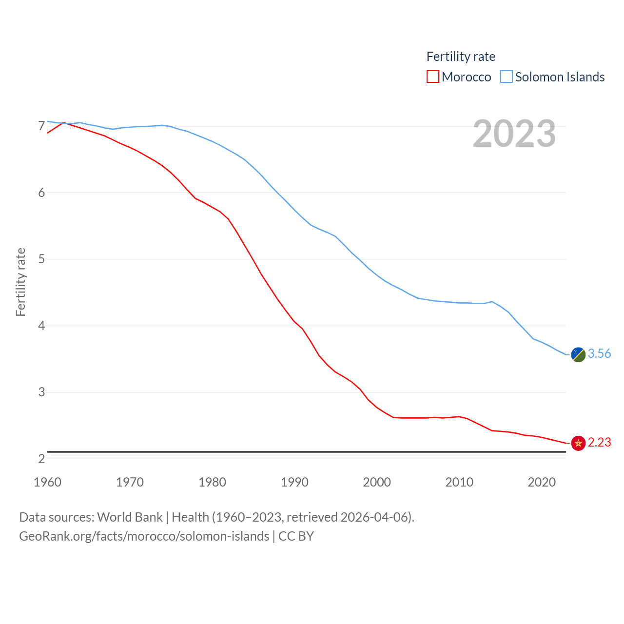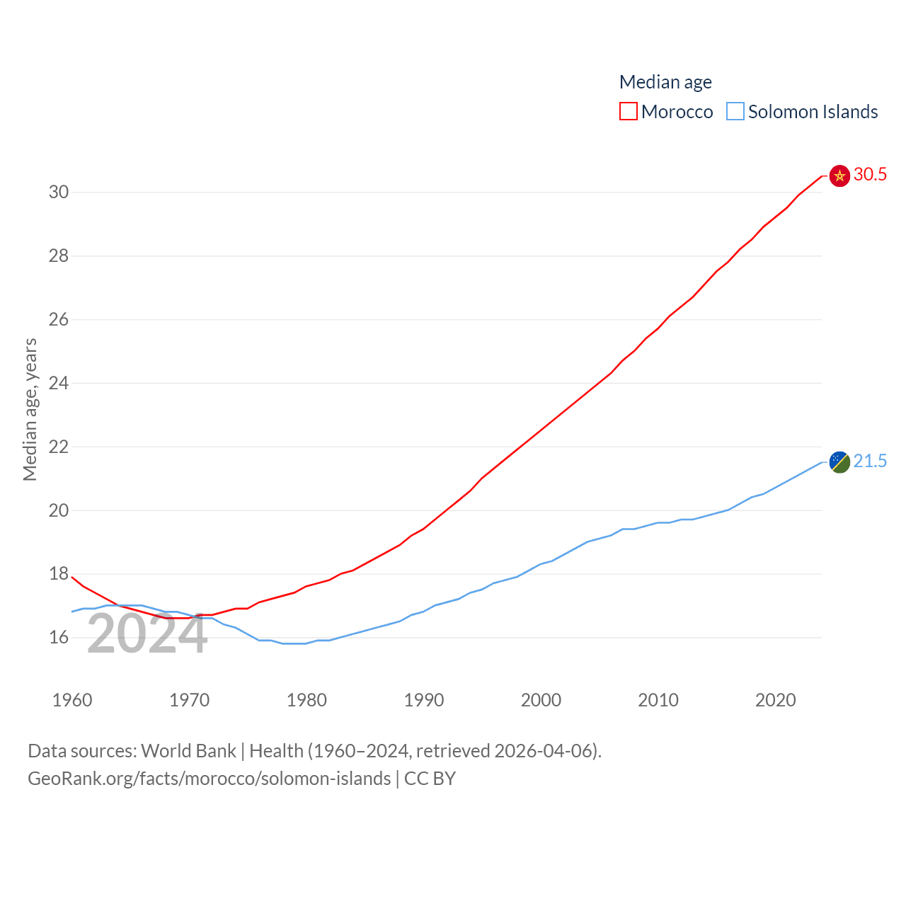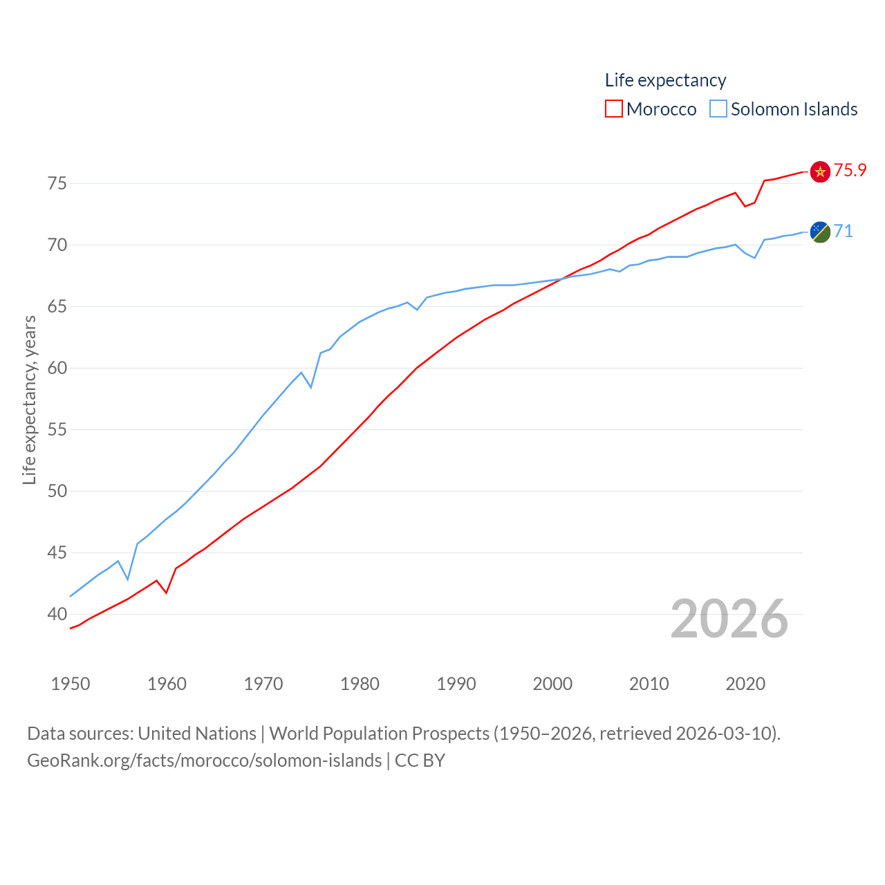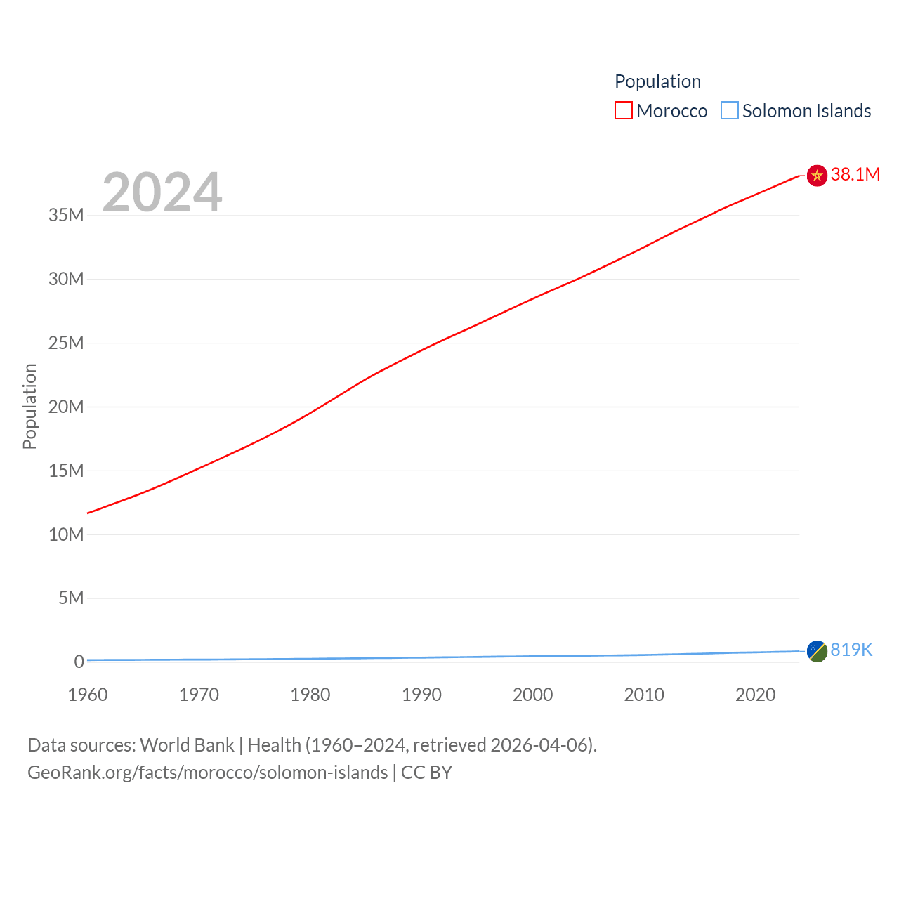 Morocco has a population of 38.1M (ranked 39/197), compared with 819K in The Solomon Islands (ranked 162/197). Morocco's land area is 172,317 sq mi versus 10,807 sq mi for The Solomon Islands (ranked 55th vs. 141st).