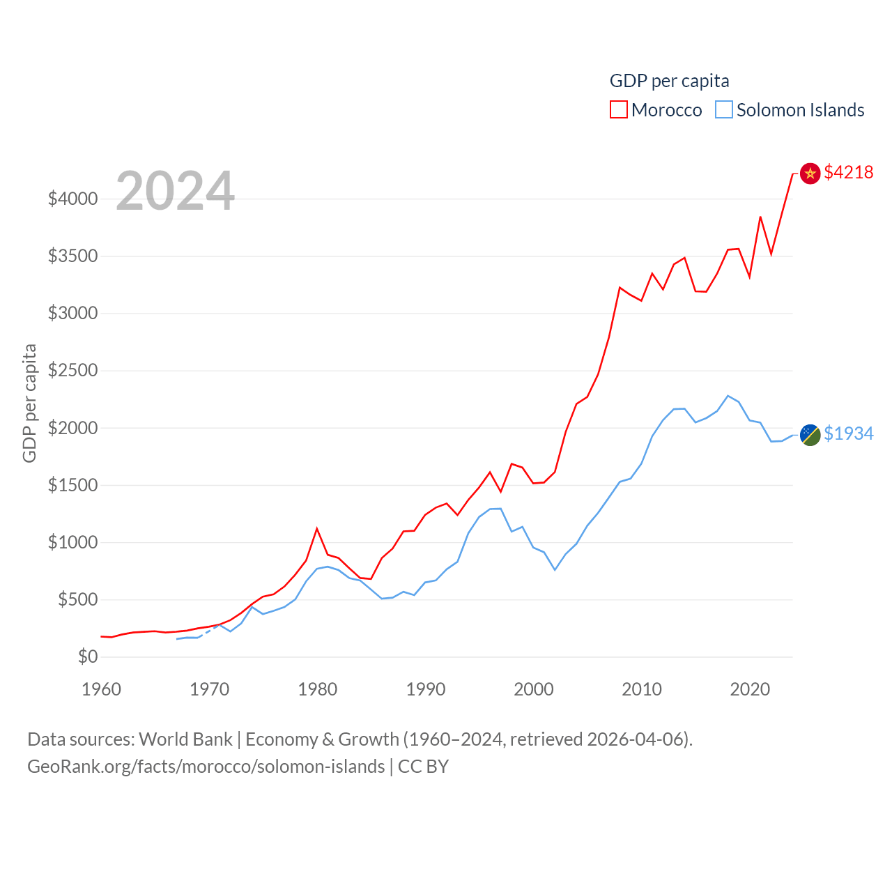 By GDP, Morocco ranks 58/197 ($161B) and The Solomon Islands ranks 182/197 ($1.58B). By GDP per capita, Morocco ranks 127/197 ($4,218), while The Solomon Islands ranks 157/197 ($1,934).