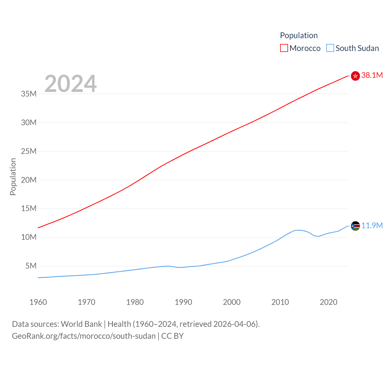 Morocco has a population of 38.1M (ranked 39/197), compared with 11.9M in South Sudan (ranked 81/197). Morocco's land area is 172,317 sq mi versus 243,990 sq mi for South Sudan (ranked 55th vs. 41st).