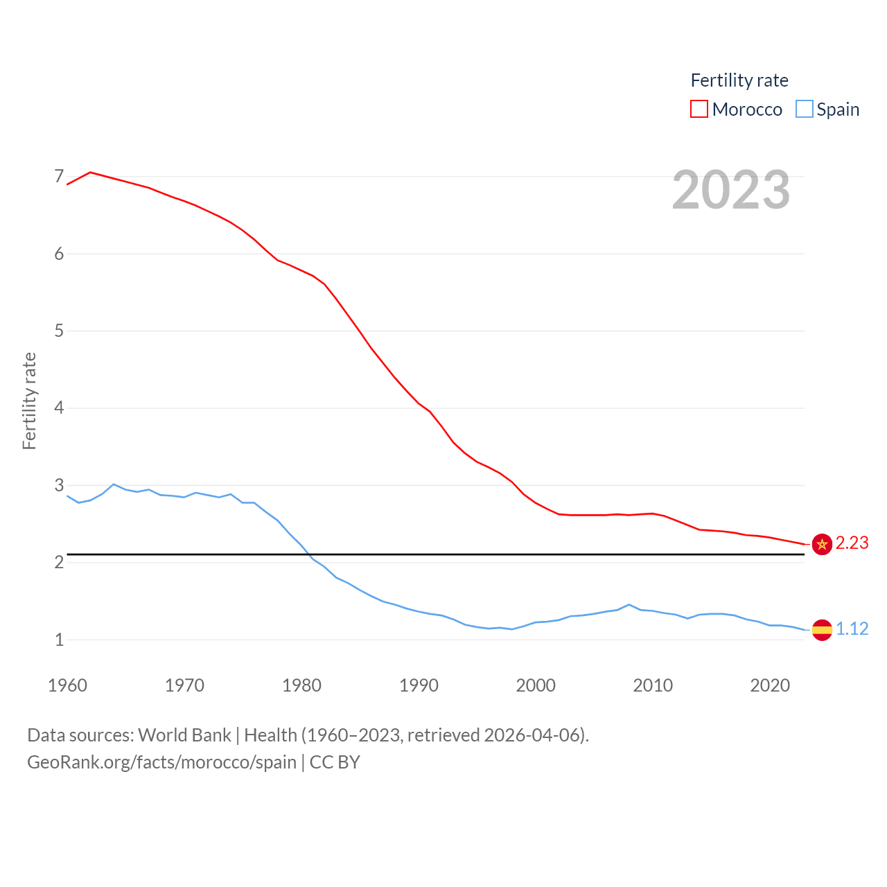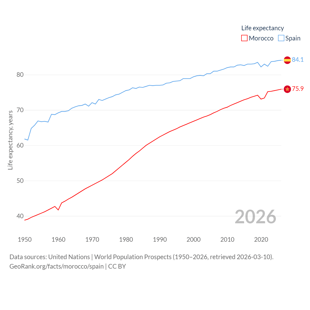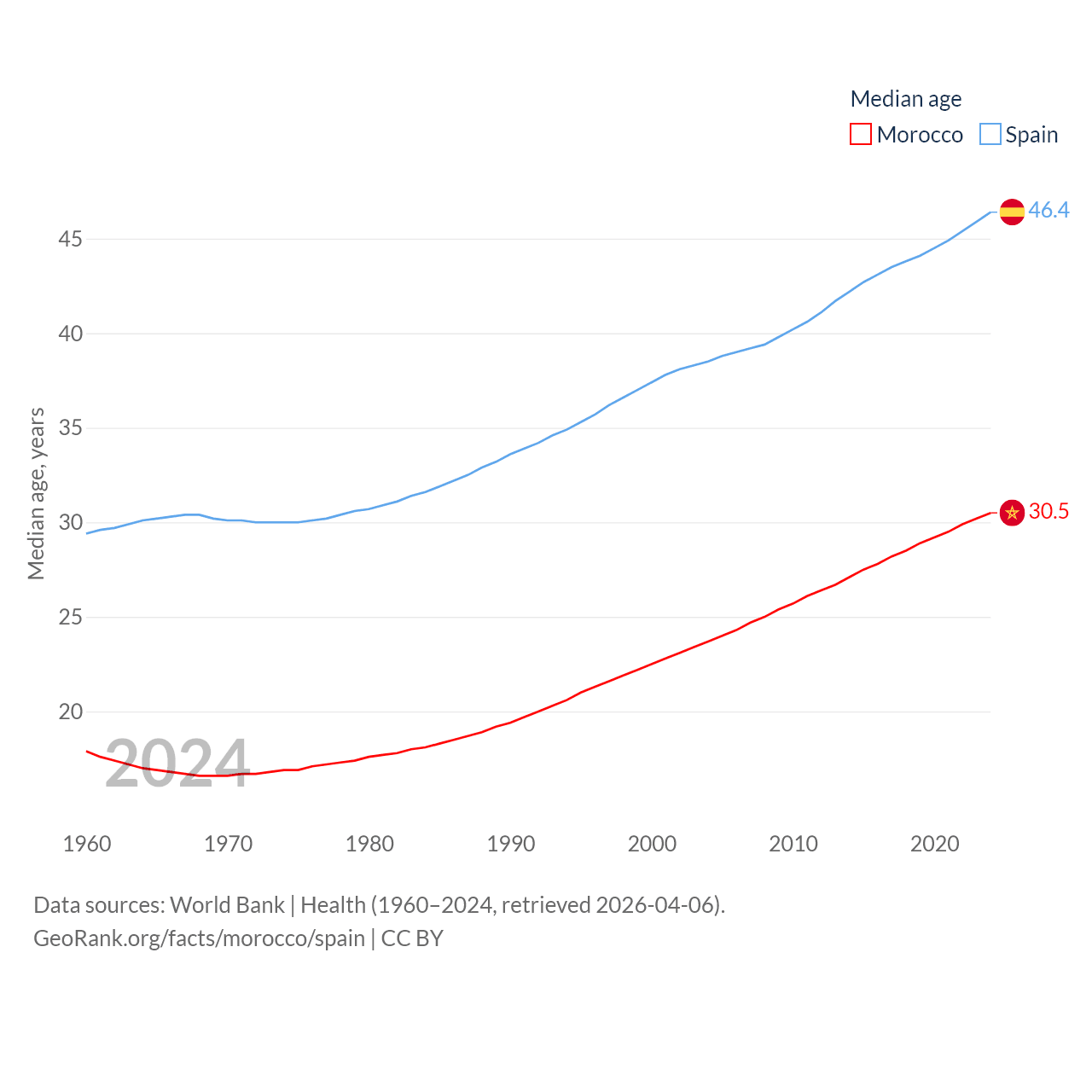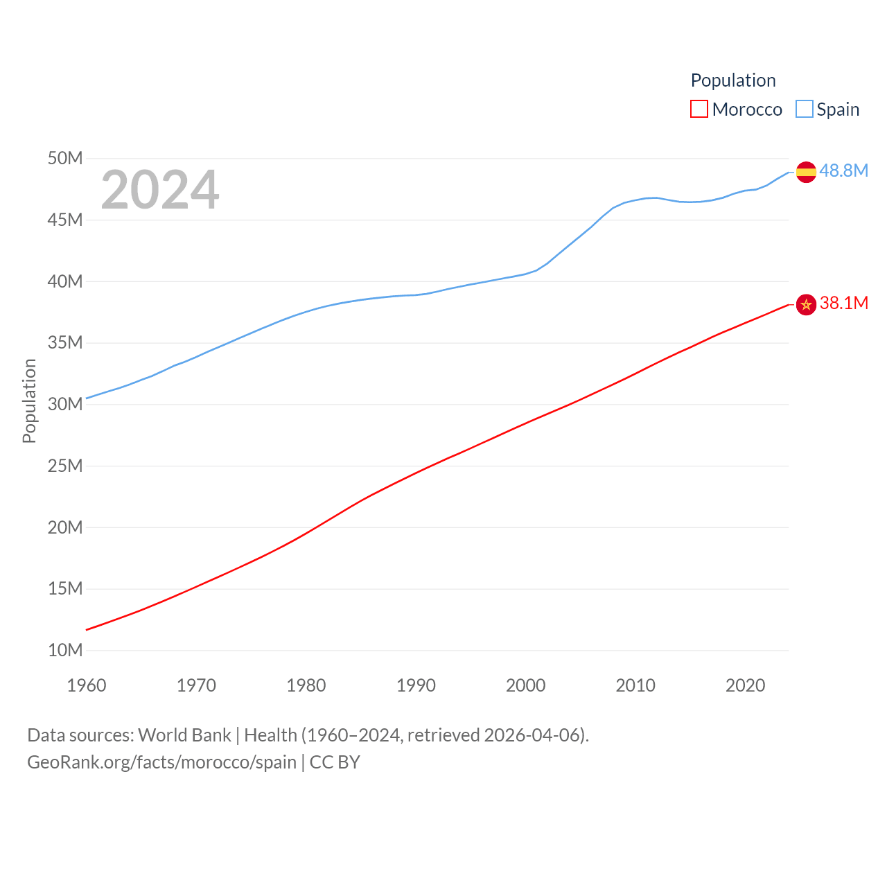 Morocco has a population of 38.1M (ranked 39/197), compared with 48.8M in Spain (ranked 32/197). Morocco's land area is 172,317 sq mi versus 192,934 sq mi for Spain (ranked 55th vs. 51st).