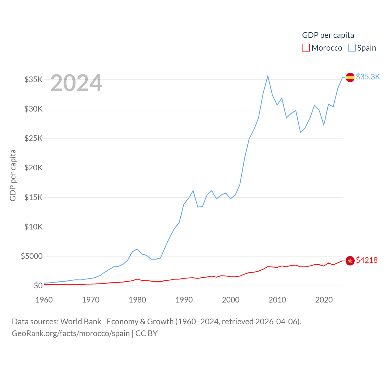 By GDP, Morocco ranks 58/197 ($161B) and Spain ranks 15/197 ($1.73T). By GDP per capita, Morocco ranks 127/197 ($4,218), while Spain ranks 32/197 ($35,327).
