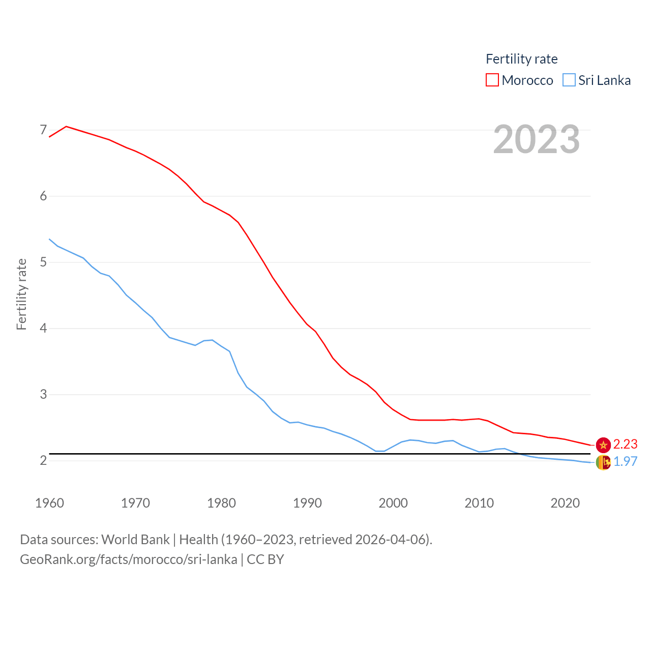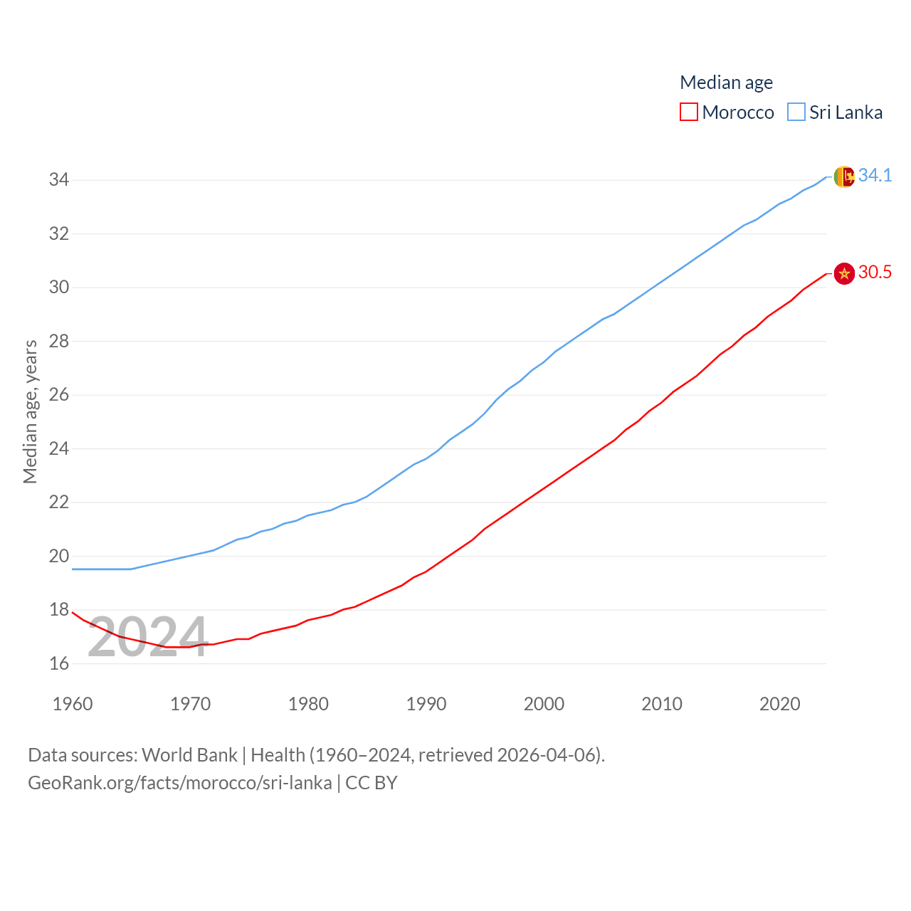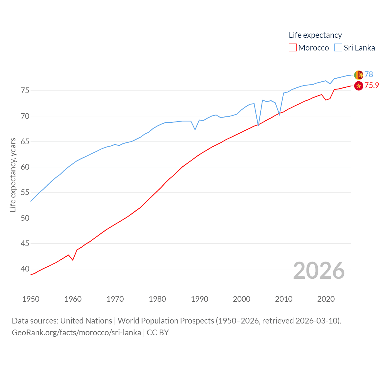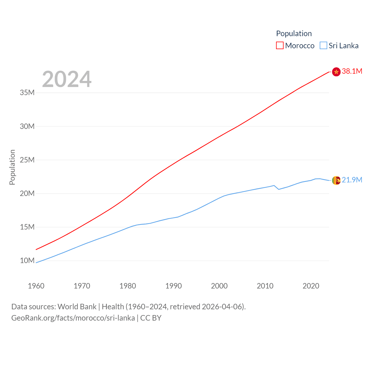 Morocco has a population of 38.1M (ranked 39/197), compared with 21.9M in Sri Lanka (ranked 61/197). Morocco's land area is 172,317 sq mi versus 23,884 sq mi for Sri Lanka (ranked 55th vs. 122nd).