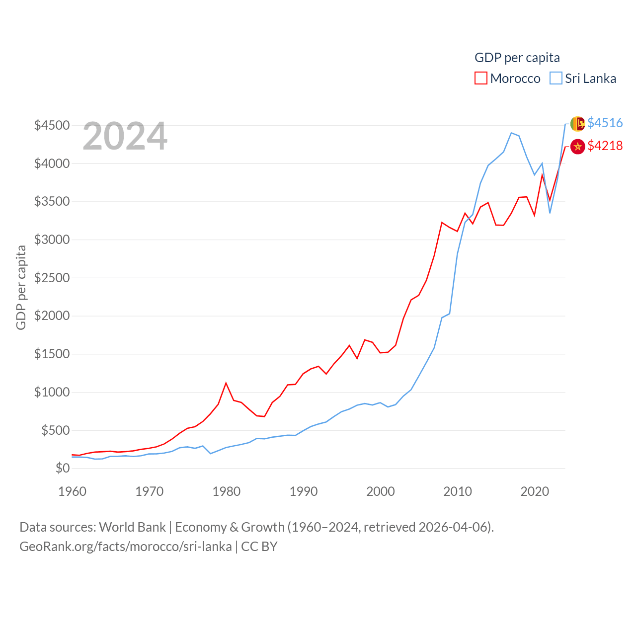 By GDP, Morocco ranks 58/197 ($161B) and Sri Lanka ranks 72/197 ($99B). By GDP per capita, Morocco ranks 127/197 ($4,218), while Sri Lanka ranks 124/197 ($4,516).