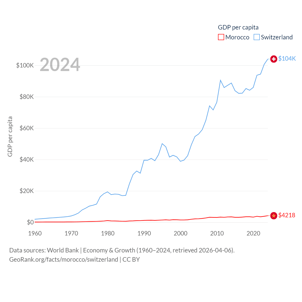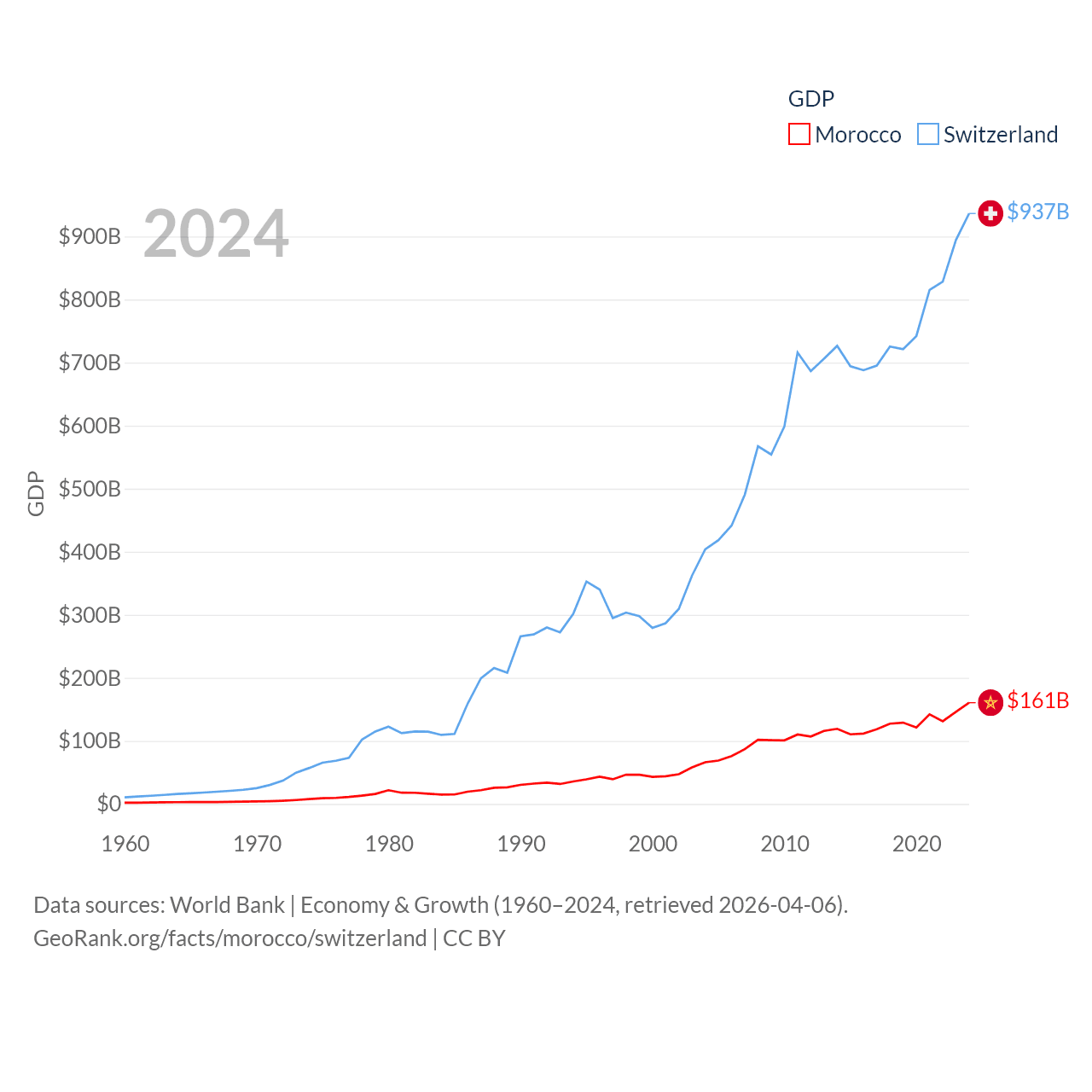 By GDP, Morocco ranks 58/197 ($161B) and Switzerland ranks 20/197 ($937B). By GDP per capita, Morocco ranks 127/197 ($4,218), while Switzerland ranks 5/197 ($103,998).