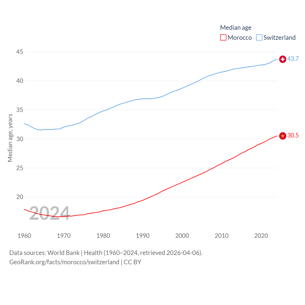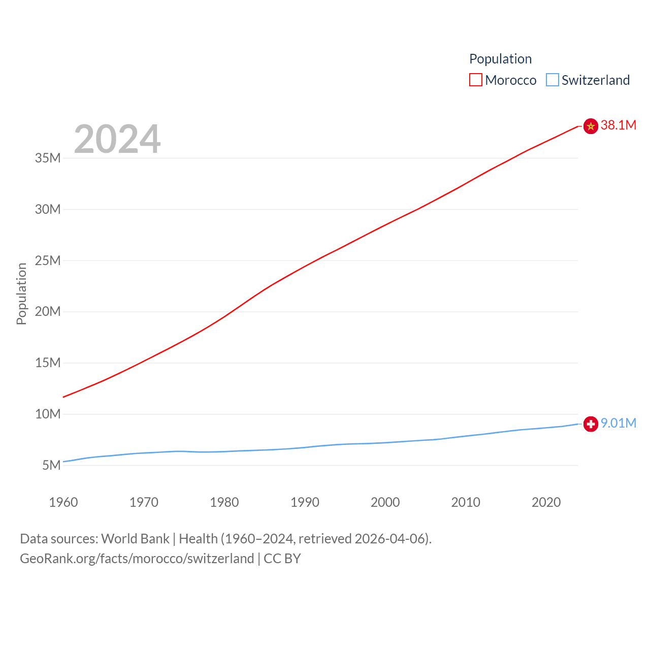 Morocco has a population of 38.1M (ranked 39/197), compared with 9.01M in Switzerland (ranked 101/197). Morocco's land area is 172,317 sq mi versus 15,255 sq mi for Switzerland (ranked 55th vs. 131st).
