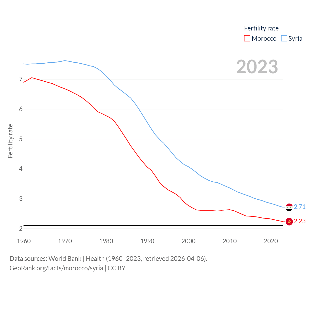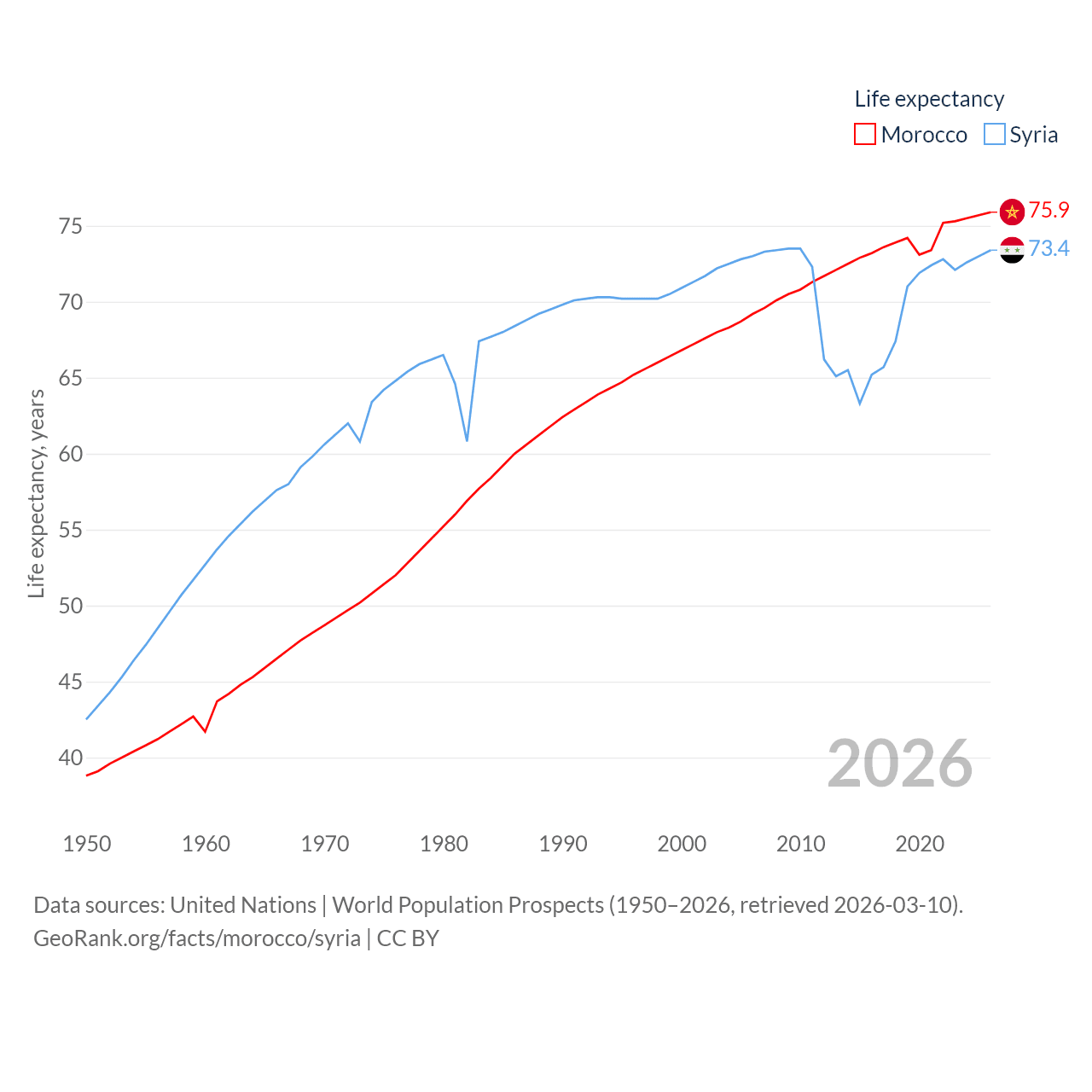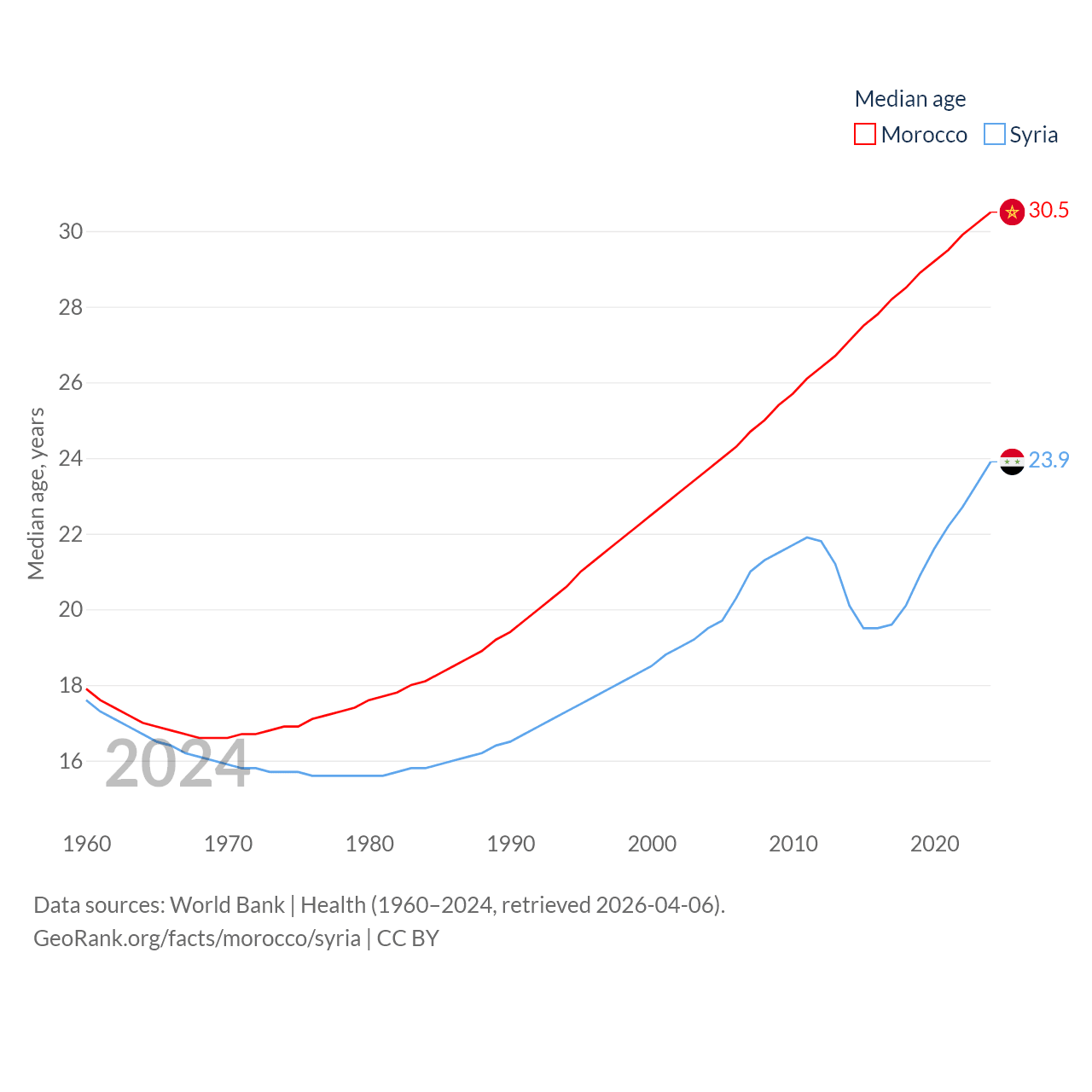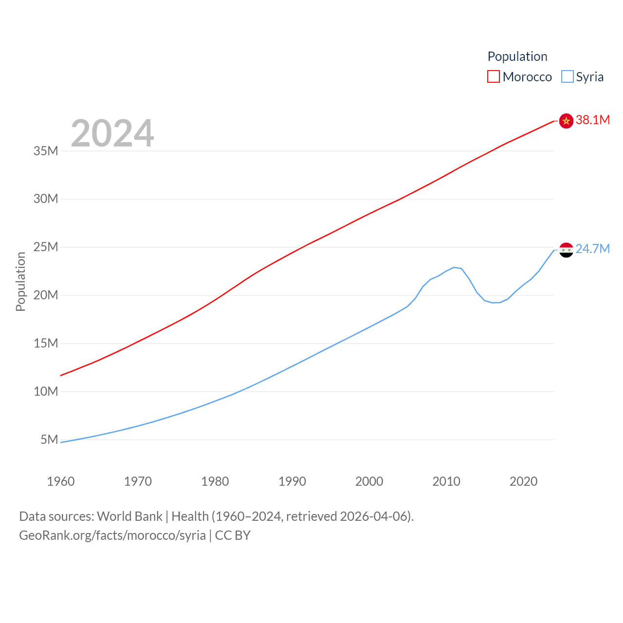 Morocco has a population of 38.1M (ranked 39/197), compared with 24.7M in Syria (ranked 57/197). Morocco's land area is 172,317 sq mi versus 70,900 sq mi for Syria (ranked 55th vs. 87th).
