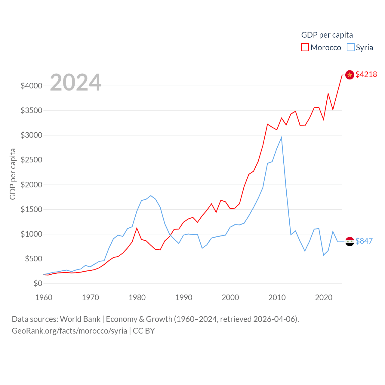 By GDP, Morocco ranks 58/197 ($161B) and Syria ranks 129/197 ($20B). By GDP per capita, Morocco ranks 127/197 ($4,218), while Syria ranks 185/197 ($847).