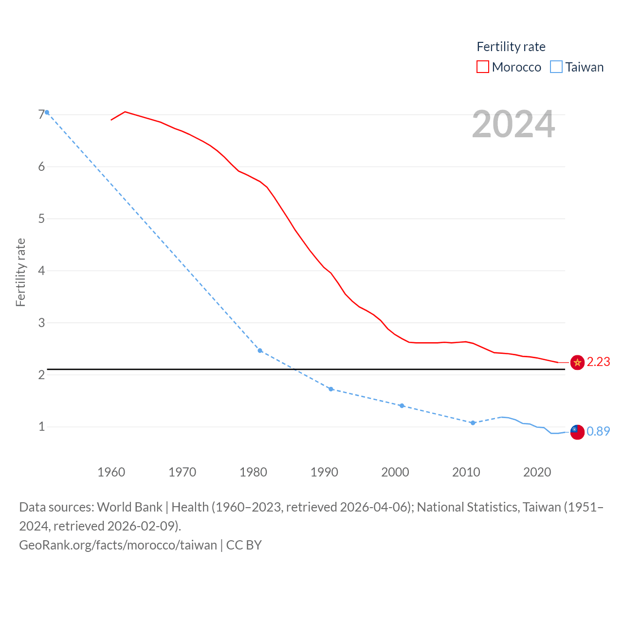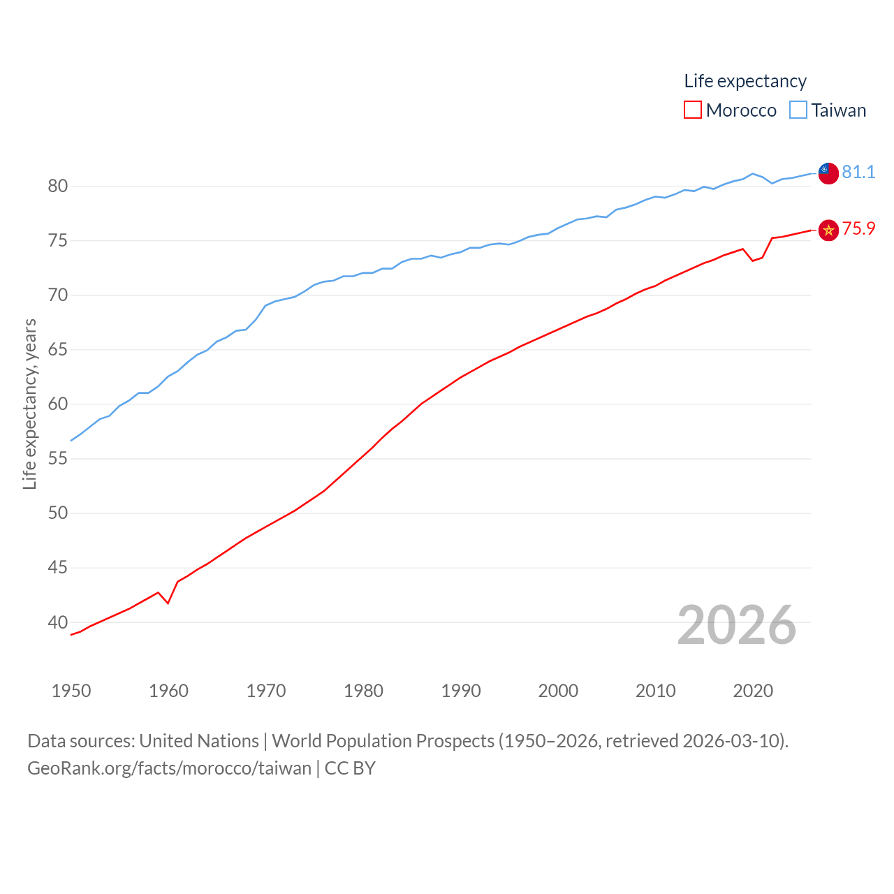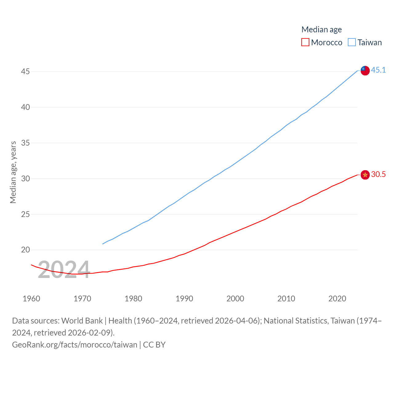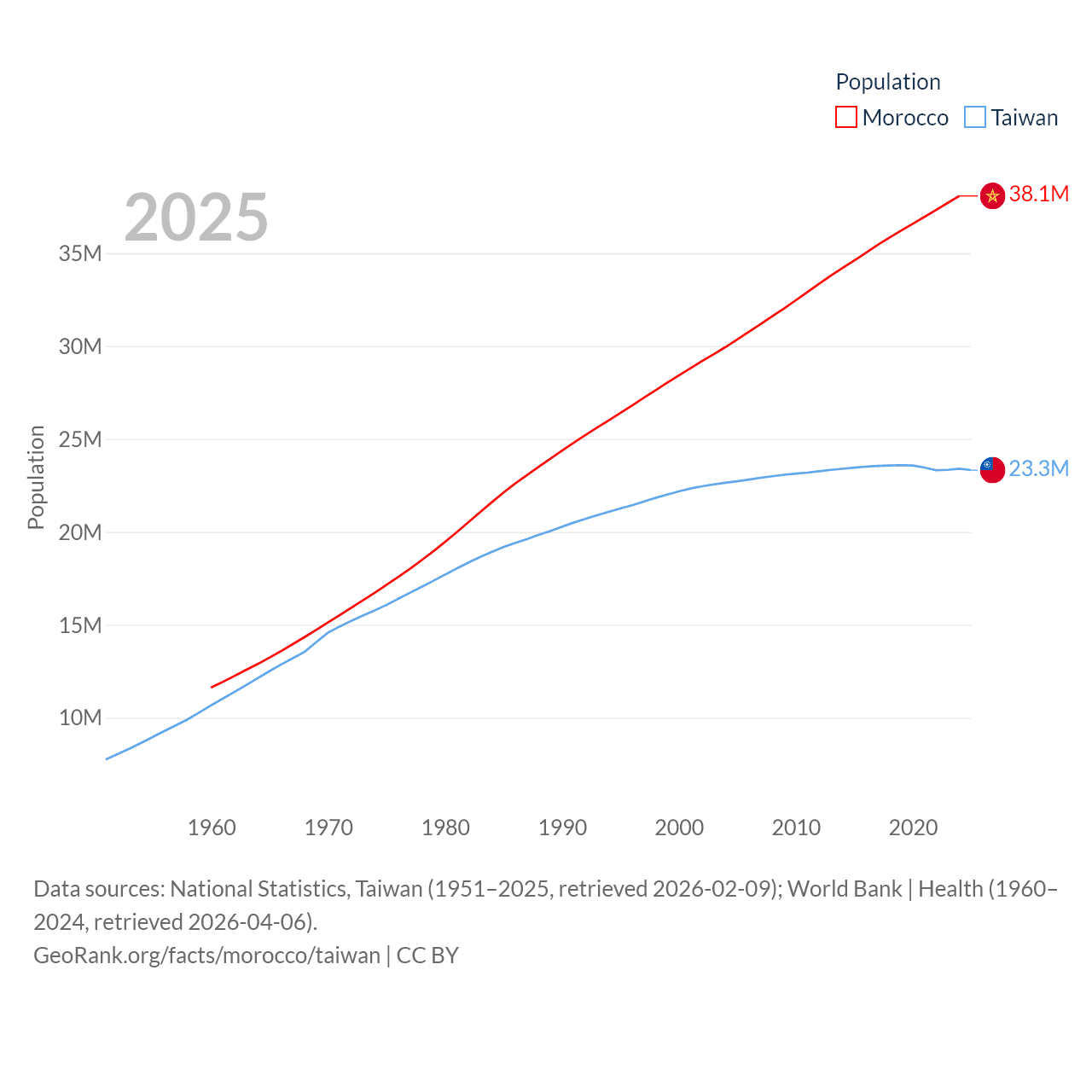 Morocco has a population of 38.1M (ranked 39/197), compared with 23.3M in Taiwan (ranked 60/197). Morocco's land area is 172,317 sq mi versus 13,976 sq mi for Taiwan (ranked 55th vs. 133rd).
