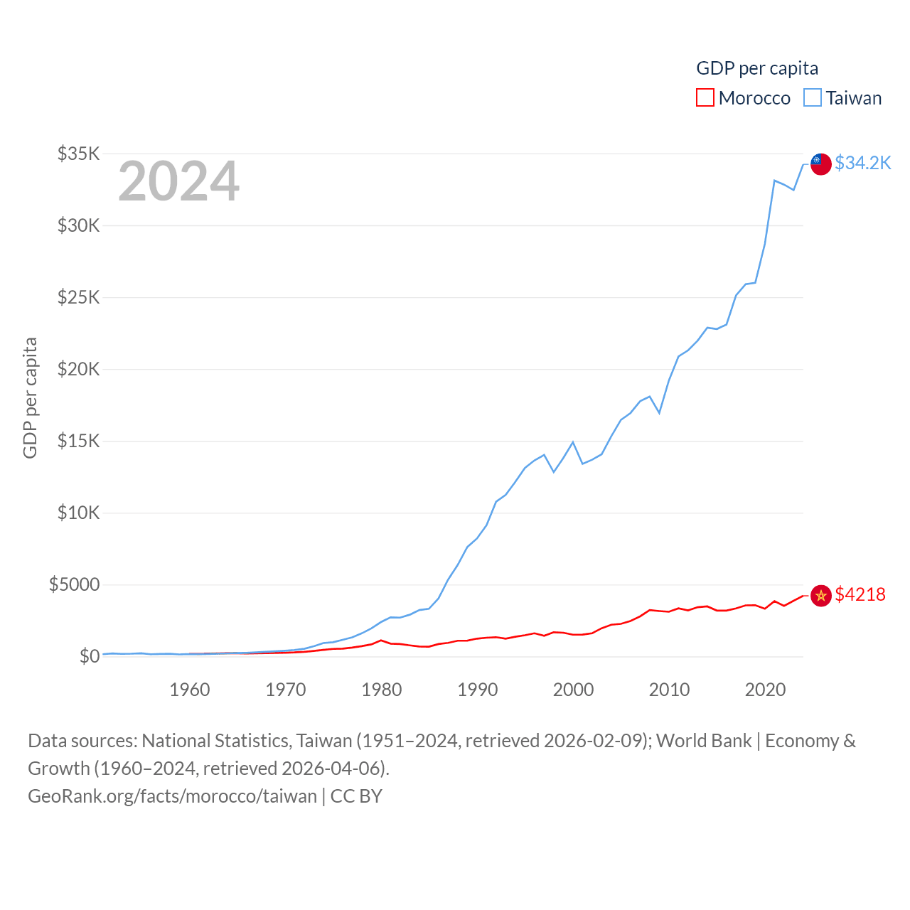 By GDP, Morocco ranks 58/197 ($161B) and Taiwan ranks 22/197 ($802B). By GDP per capita, Morocco ranks 127/197 ($4,218), while Taiwan ranks 35/197 ($34,238).