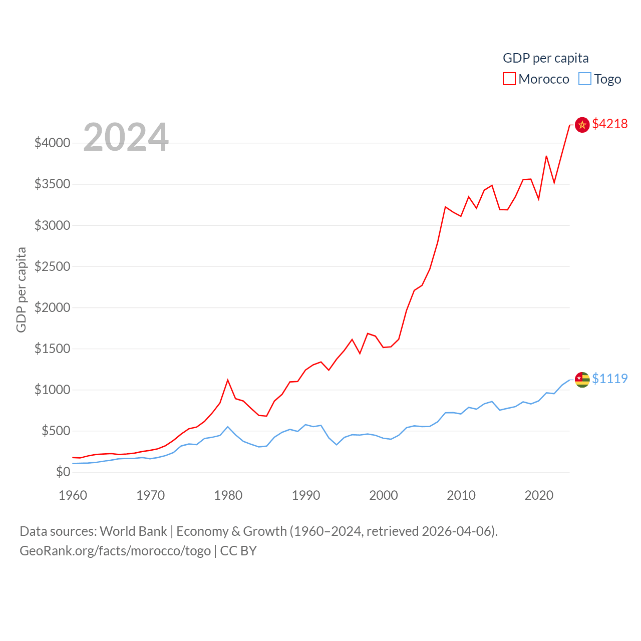 By GDP, Morocco ranks 58/197 ($161B) and Togo ranks 154/197 ($10.7B). By GDP per capita, Morocco ranks 127/197 ($4,218), while Togo ranks 172/197 ($1,119).