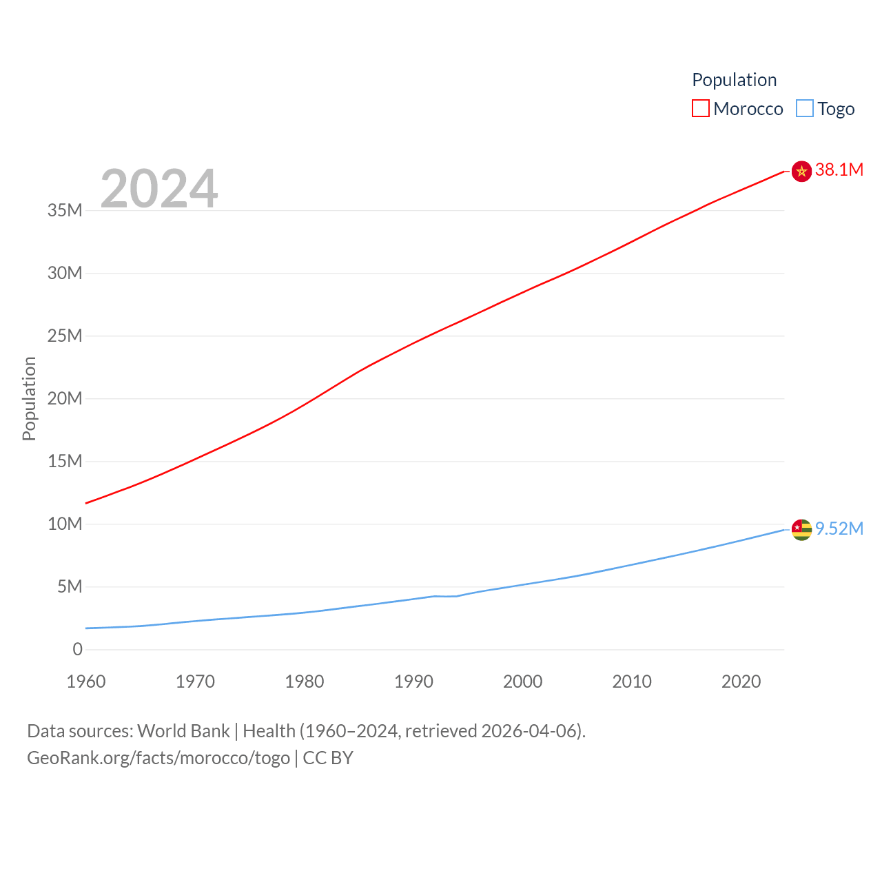 Morocco has a population of 38.1M (ranked 39/197), compared with 9.52M in Togo (ranked 98/197). Morocco's land area is 172,317 sq mi versus 21,000 sq mi for Togo (ranked 55th vs. 124th).