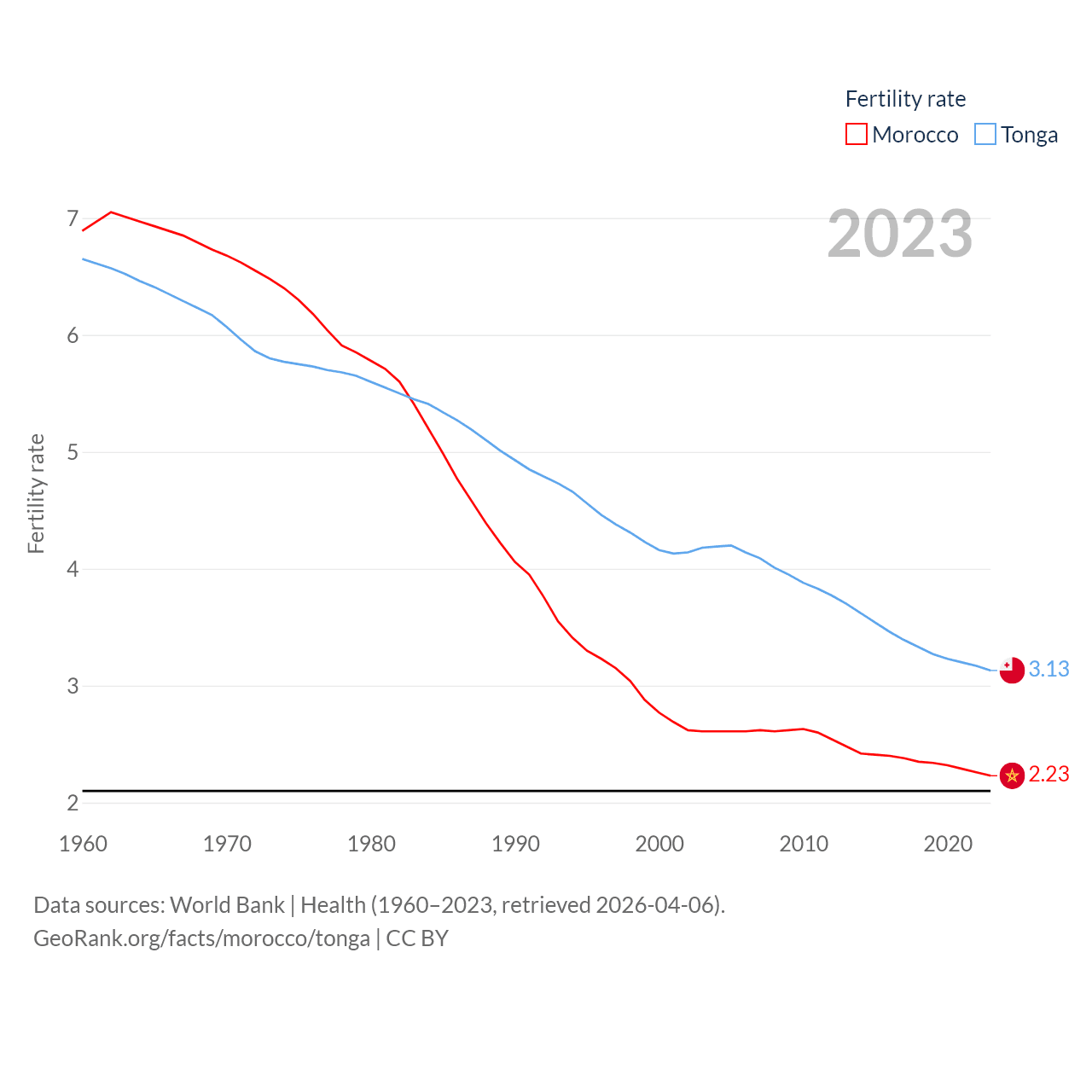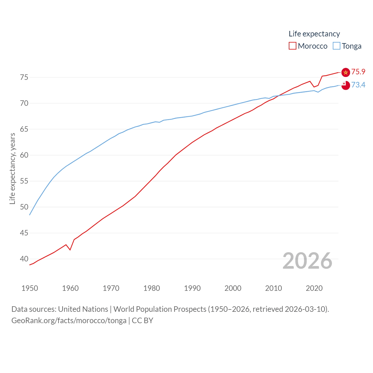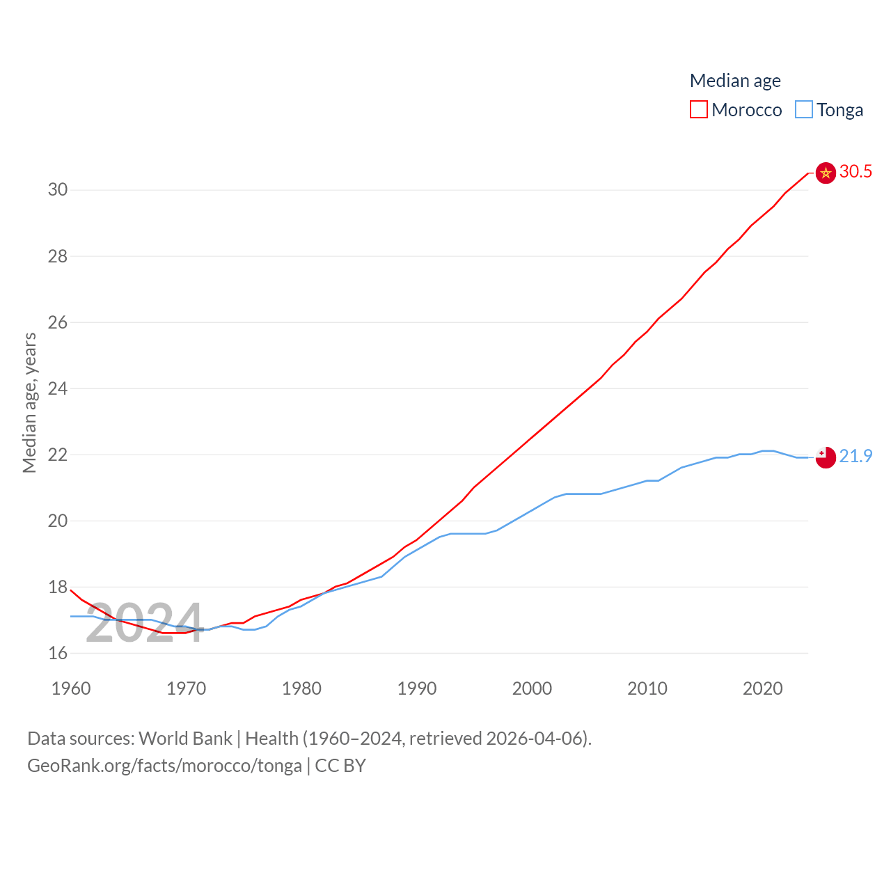 Morocco has a population of 38.1M (ranked 39/197), compared with 104K in Tonga (ranked 183/197). Morocco's land area is 172,317 sq mi versus 278 sq mi for Tonga (ranked 55th vs. 176th).