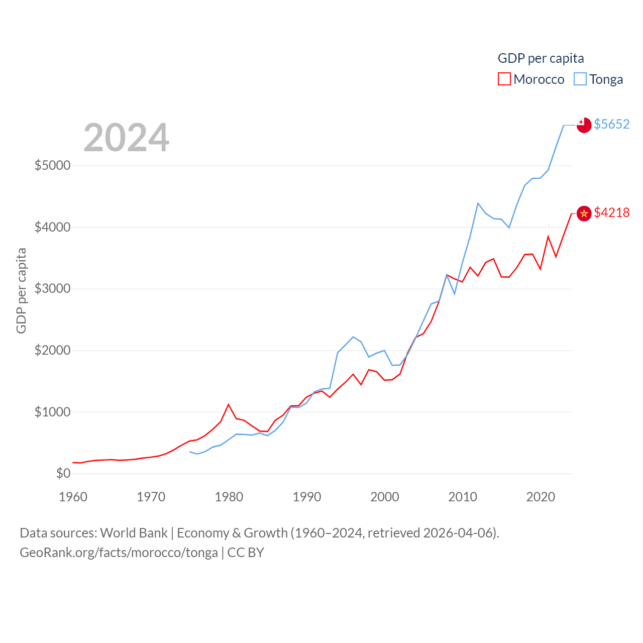 By GDP, Morocco ranks 58/197 ($161B) and Tonga ranks 191/197 ($591M). By GDP per capita, Morocco ranks 127/197 ($4,218), while Tonga ranks 115/197 ($5,652).