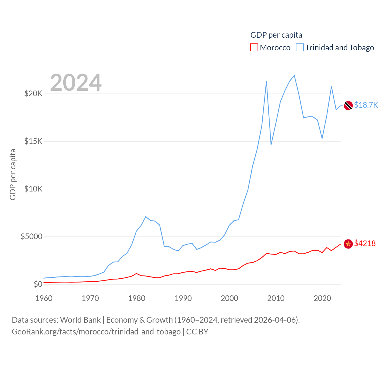 By GDP, Morocco ranks 58/197 ($161B) and Trinidad and Tobago ranks 115/197 ($25.6B). By GDP per capita, Morocco ranks 127/197 ($4,218), while Trinidad and Tobago ranks 61/197 ($18,733).