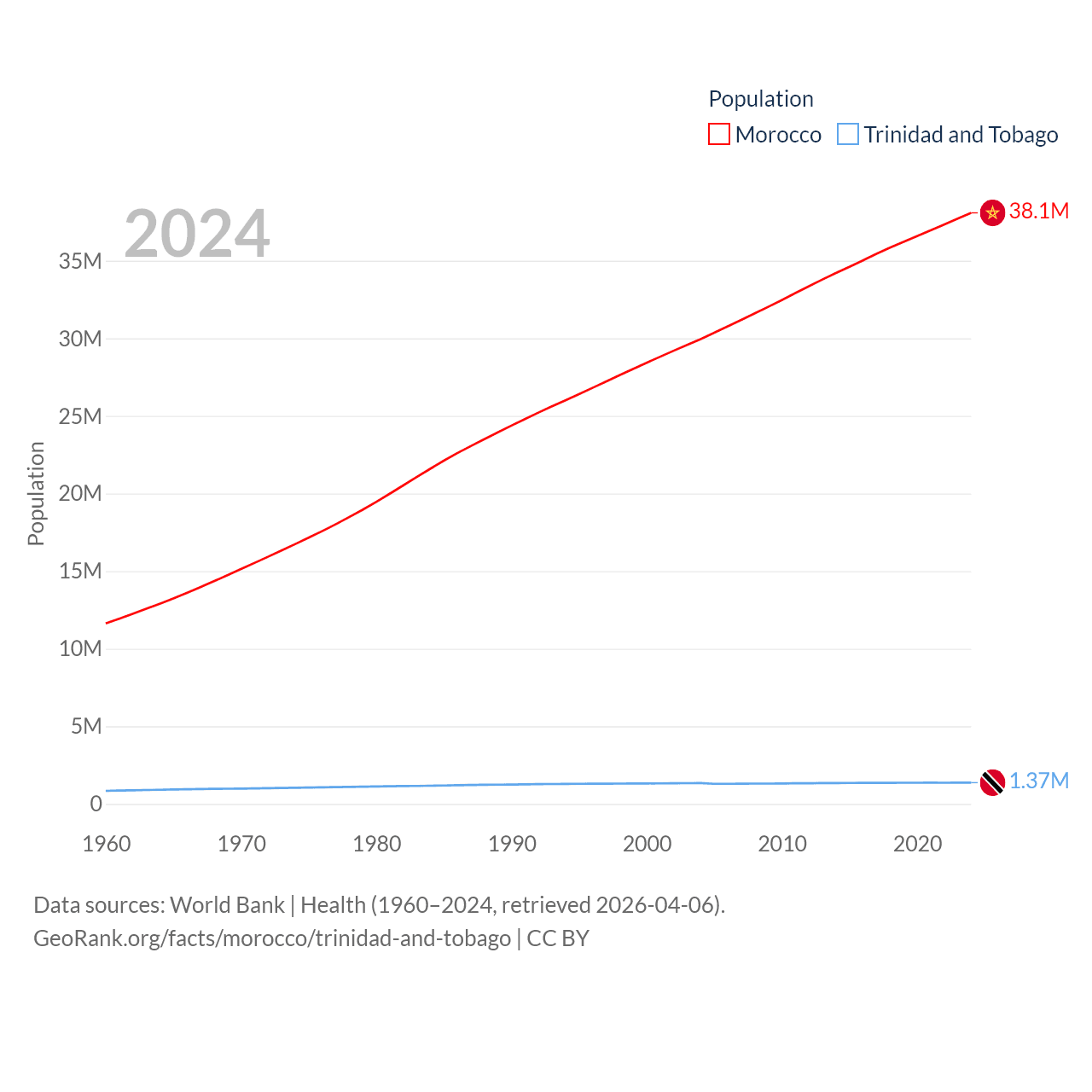 Morocco has a population of 38.1M (ranked 39/197), compared with 1.37M in Trinidad and Tobago (ranked 154/197). Morocco's land area is 172,317 sq mi versus 1,981 sq mi for Trinidad and Tobago (ranked 55th vs. 166th).
