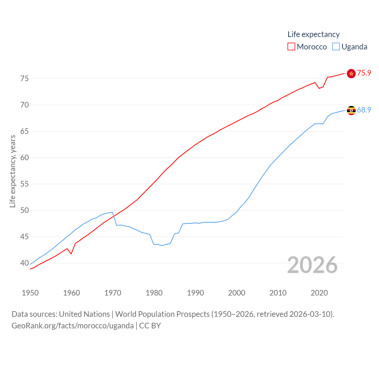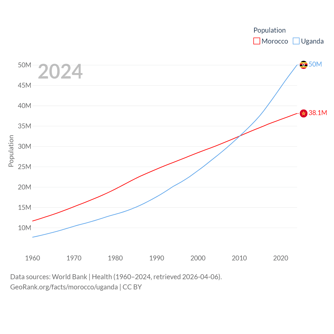 Morocco has a population of 38.1M (ranked 39/197), compared with 50M in Uganda (ranked 31/197). Morocco's land area is 172,317 sq mi versus 77,421 sq mi for Uganda (ranked 55th vs. 84th).